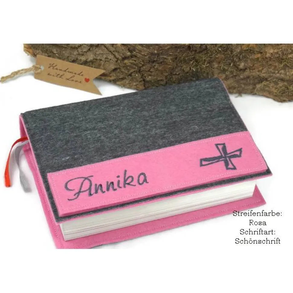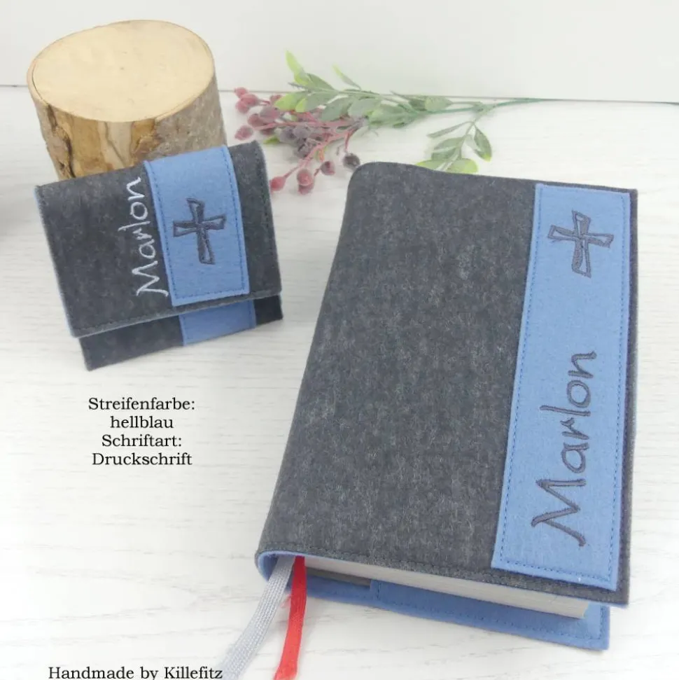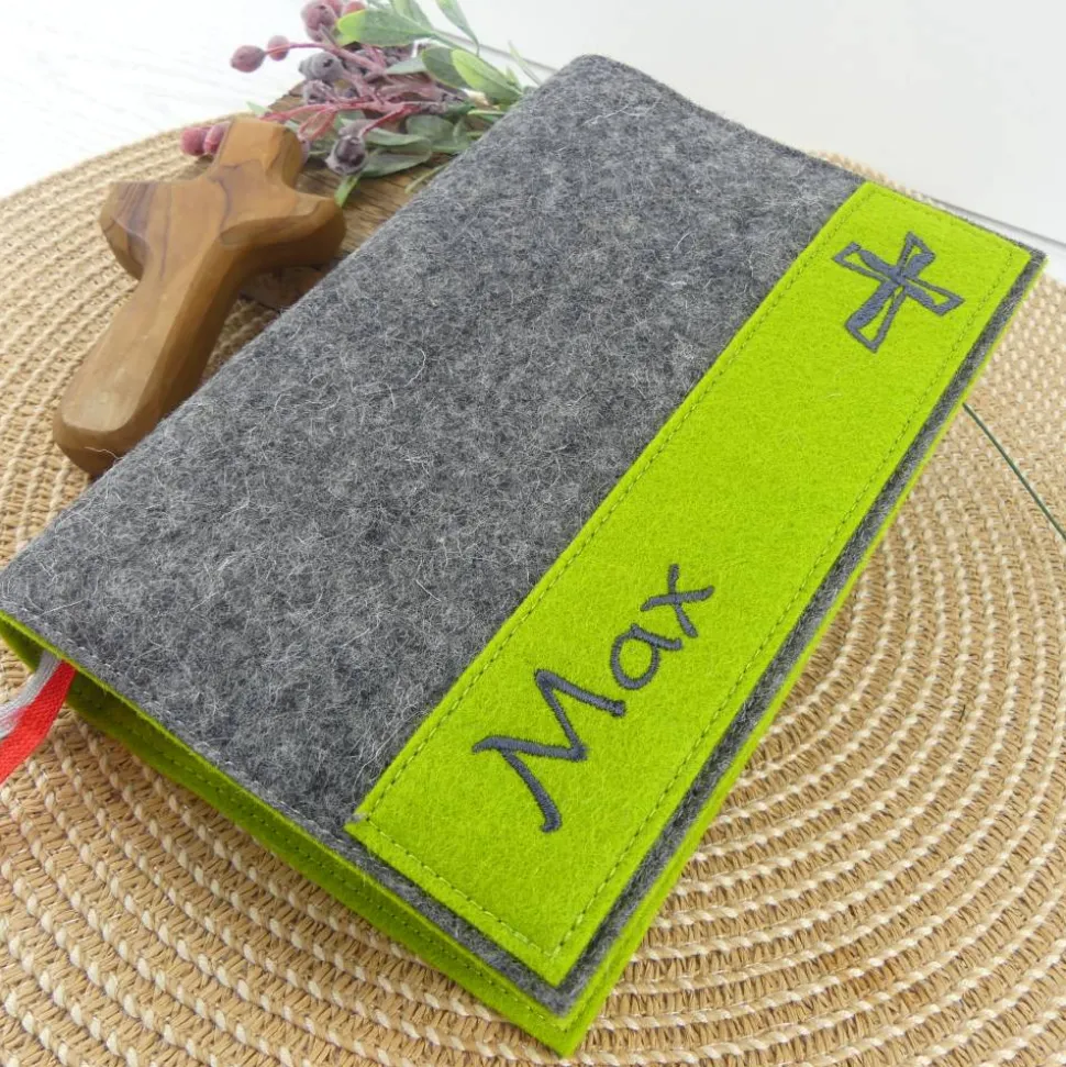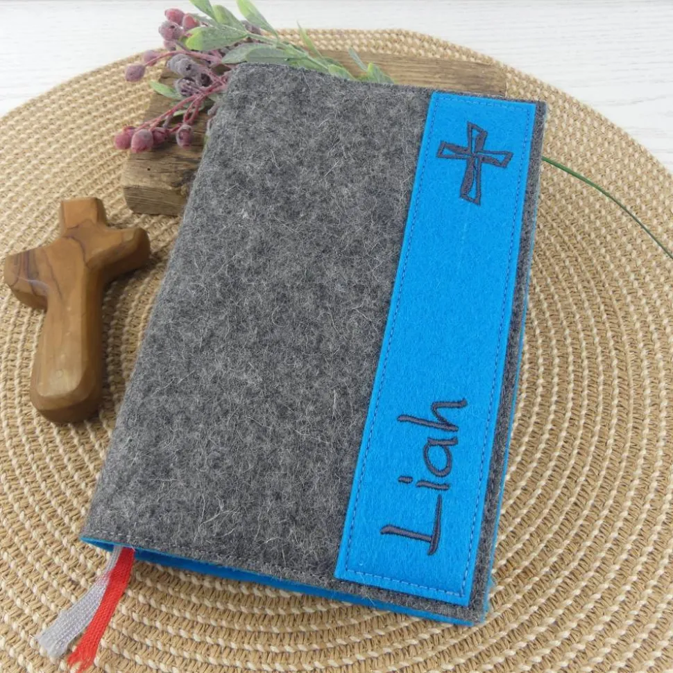 Entdecke die schlichte und dennoch edle Gotteslobhülle/Bibelhülle aus hochwertigem, grauem Filz. Das Besondere an dieser Hülle ist der farbige Kontraststreifen mit eingesticktem Kreuz, der individuell in deiner Wunschfarbe gefertigt wird. Dein persönlicher Name macht die Hülle zu einem einzigartigen Unikat – ein ganz besonderes Geschenk zur Kommunion, Firmung oder Konfirmation.