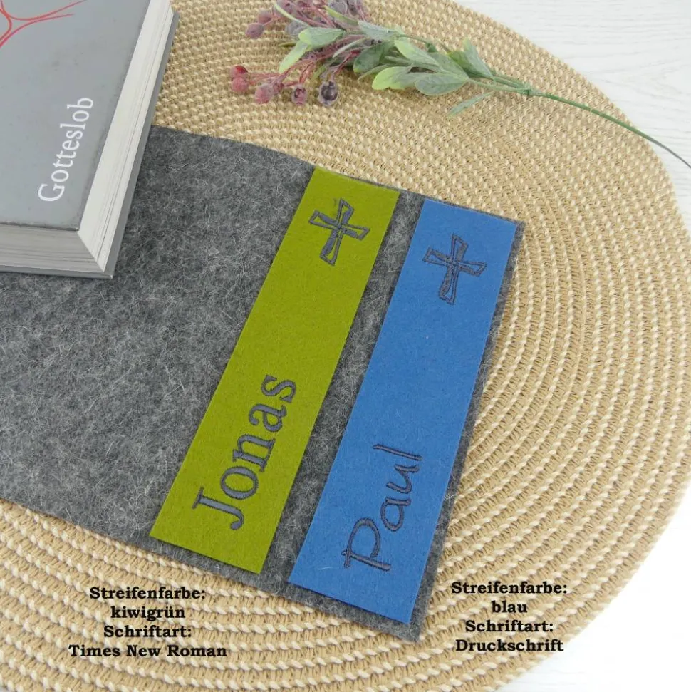 Wähle die Farbe des Streifens und des Innenfilzes individuell aus. Das Kreuz wird immer eingestickt, weitere Texte wie Name oder „Gotteslob“ kannst du optional hinzufügen. Details und Wunschtexte gib bitte während des Bestellvorgangs an.