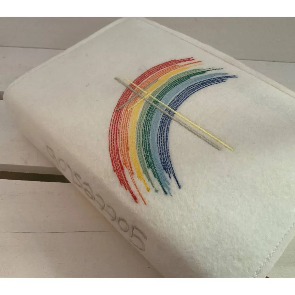 Auf Wunsch kann die Hülle mit dem Namen des Kindes bestickt werden – den Wunschname und/oder das Datum des Festes auf der Innenseite.