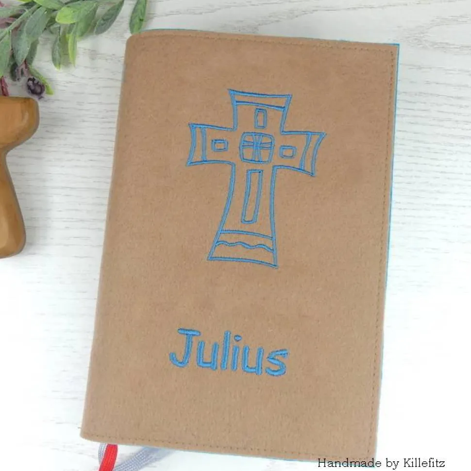 Wähle aus drei verschiedenen Kreuz-Motiven und zahlreichen Schriftarten. Der Name kann ganz nach deinen Wünschen platziert werden: hochkant oder quer entlang der Kante, unter dem Kreuz, am Buchrücken oder innen im Einschlag. So gestaltest du ein echtes Unikat – ideal als Geschenk zur Kommunion oder Konfirmation.
