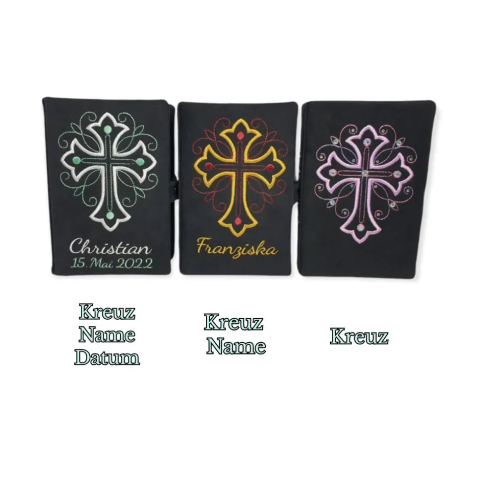 Wähle im Bestellvorgang die Farben für das Kreuz ( entweder alles einfarbig oder jeweils: Hauptkreuz dick: eine Farbe, Linien um das Kreuz und im Kreuz: eine andere Farbe, Name, Datum, Buchrücken, Spruch etc. können gerne farblich ausgewählt werden!)