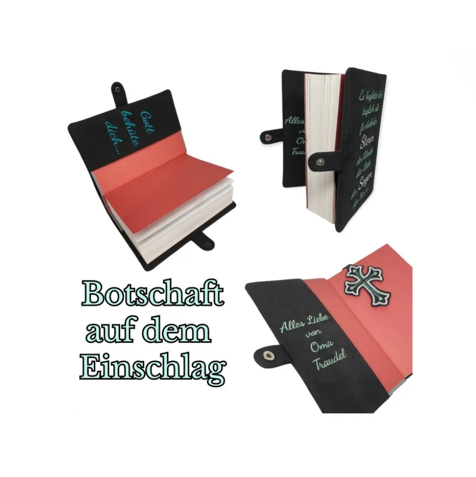 (inklusive: gesticktes Kreuz in Wunschfarben, Druckknopf, Worte auf Buchrücken)