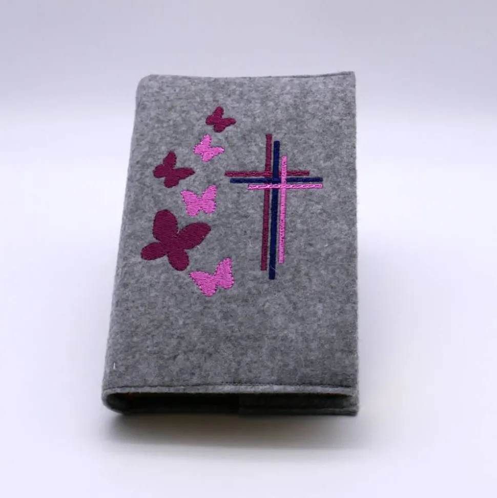 Bestickt ist sie mit Schmetterlingen in rosa und dunkelrot, sowie drei Kreuzen in rosa, dunkelrot und dunkelblau. Auf dem Buchrücken ist das Wort „Gotteslob“ mit dunkelblauem Garn gestickt.