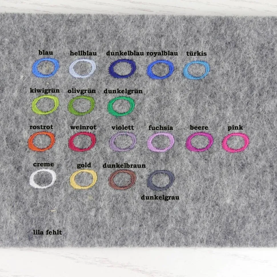 Die Einstickfarbe wählst du im Bestellvorgang. Die Filzfarbe innen ist grau, auf Wunsch auch farbig.