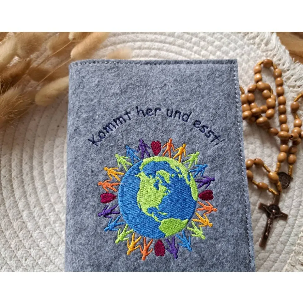 Die robuste Filzhülle ist speziell für das katholische Gotteslob ab 2013 konzipiert und lässt sich leicht auf- und zuklappen. Sie kann auch während des Gottesdienstes verwendet werden, sodass das Gotteslob jederzeit sicher geschützt ist. Auf Wunsch wird ein praktisches Gummiband eingearbeitet, das die Hülle sicher zusammenhält. Dieses verläuft auf der Rückseite, sodass die bestickte Vorderseite vollständig sichtbar bleibt.