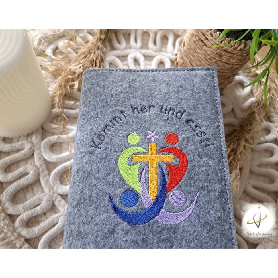 Die Hülle kann individuell mit dem Namen des Kindes und dem Datum der Erstkommunion gestaltet werden, was sie zu einem ganz besonderen Andenken an diesen wichtigen Tag macht. Die Bestickung erfolgt auf der Vorderseite der Hülle und wird mit modernster Technologie präzise und dauerhaft in den Filz eingestickt.
