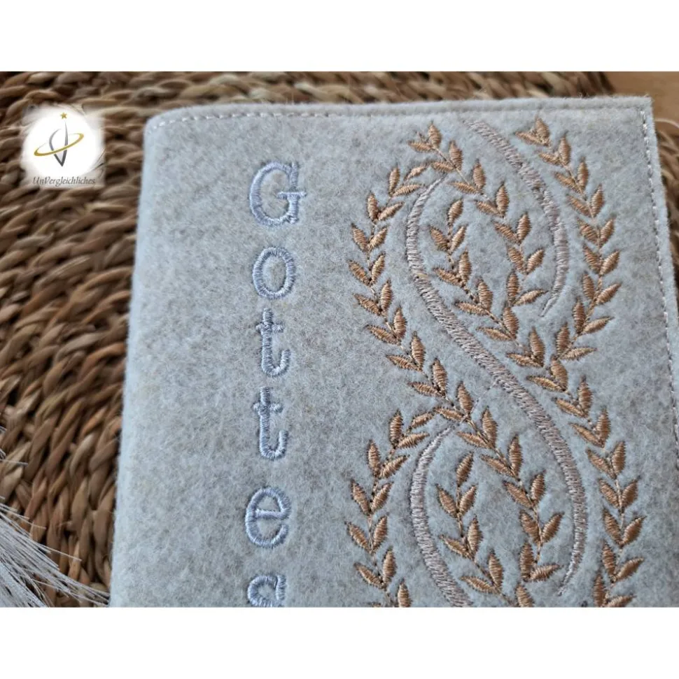 Die Hülle kann individuell mit dem Namen des Kindes und dem Datum der Erstkommunion gestaltet werden, was sie zu einem ganz besonderen Andenken an diesen wichtigen Tag macht. Die Bestickung erfolgt auf der Vorderseite der Hülle und wird mit modernster Technologie präzise und dauerhaft in den Filz eingearbeitet.