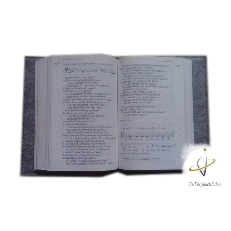 Die Filzhülle ist robust und langlebig und schützt das Gotteslob vor Schmutz und Beschädigungen. Dank des praktischen Designs ist das Gotteslob einfach einzulegen und herauszunehmen, und die Hülle kann auch während des Gottesdienstes verwendet werden.