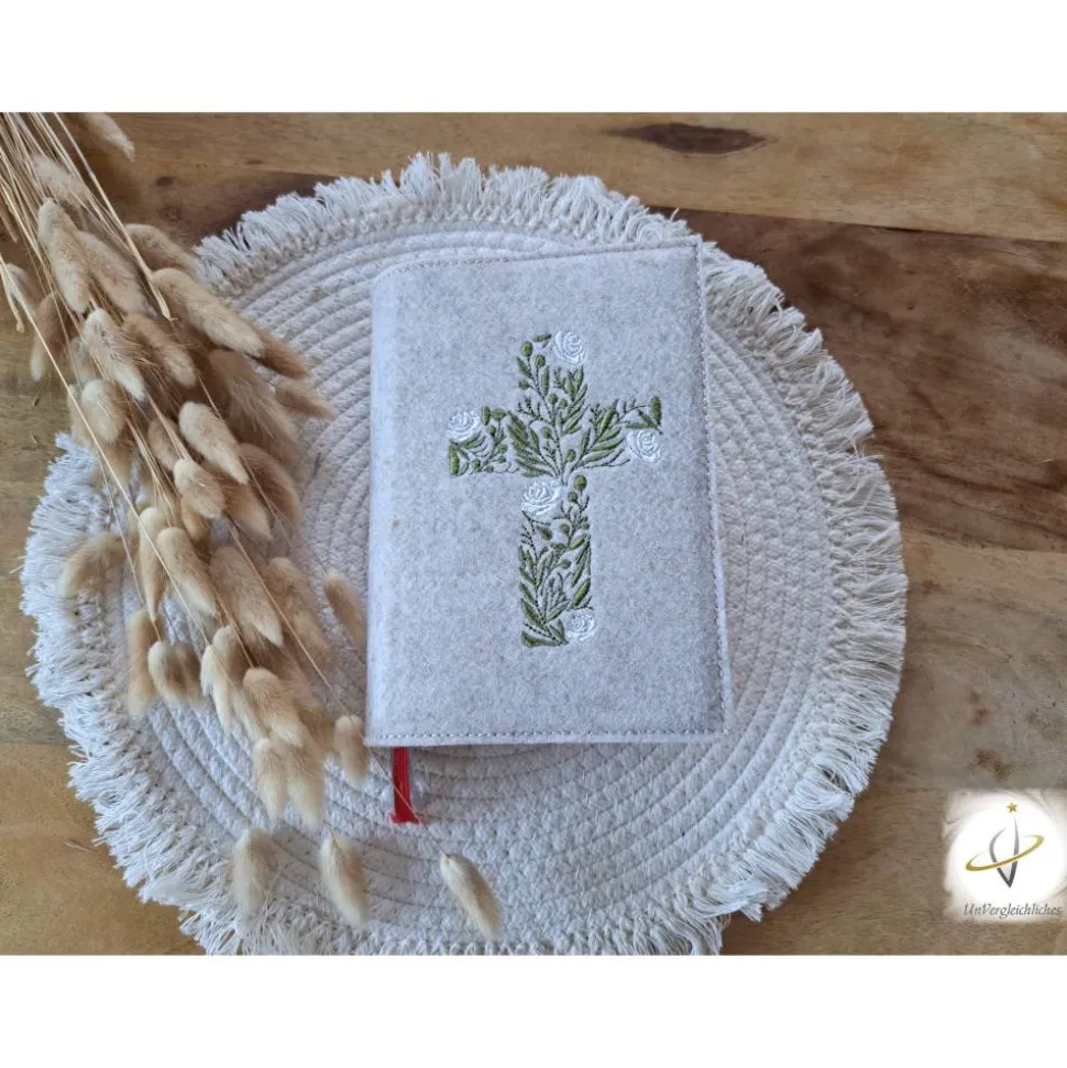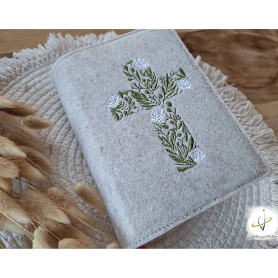 Die Hülle kann individuell mit dem Namen des Kindes und dem Datum der Erstkommunion gestaltet werden, was sie zu einem ganz besonderen Andenken an diesen wichtigen Tag macht. Die Bestickung erfolgt auf der Vorderseite der Hülle und wird mit modernster Technologie präzise und dauerhaft in den Filz eingearbeitet.