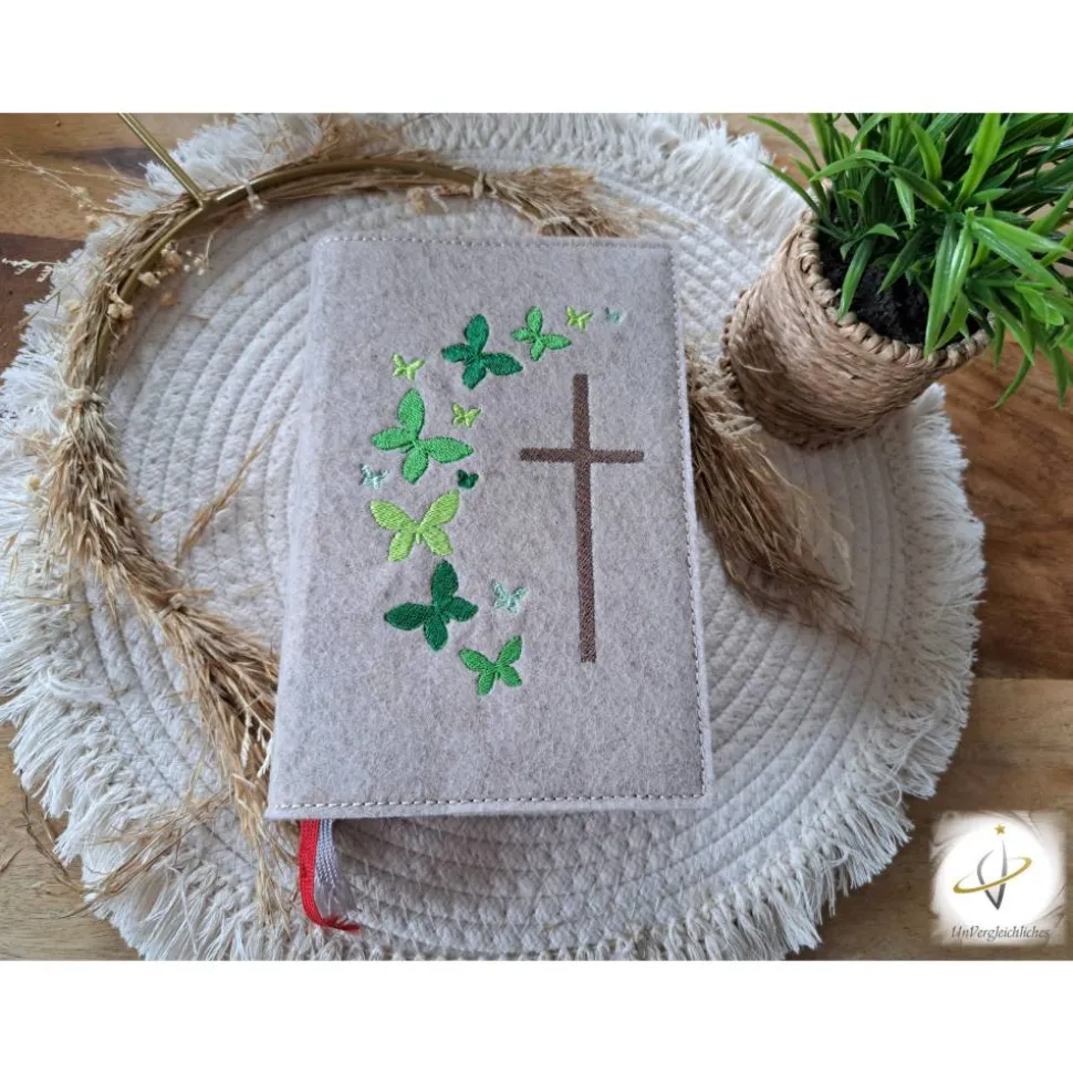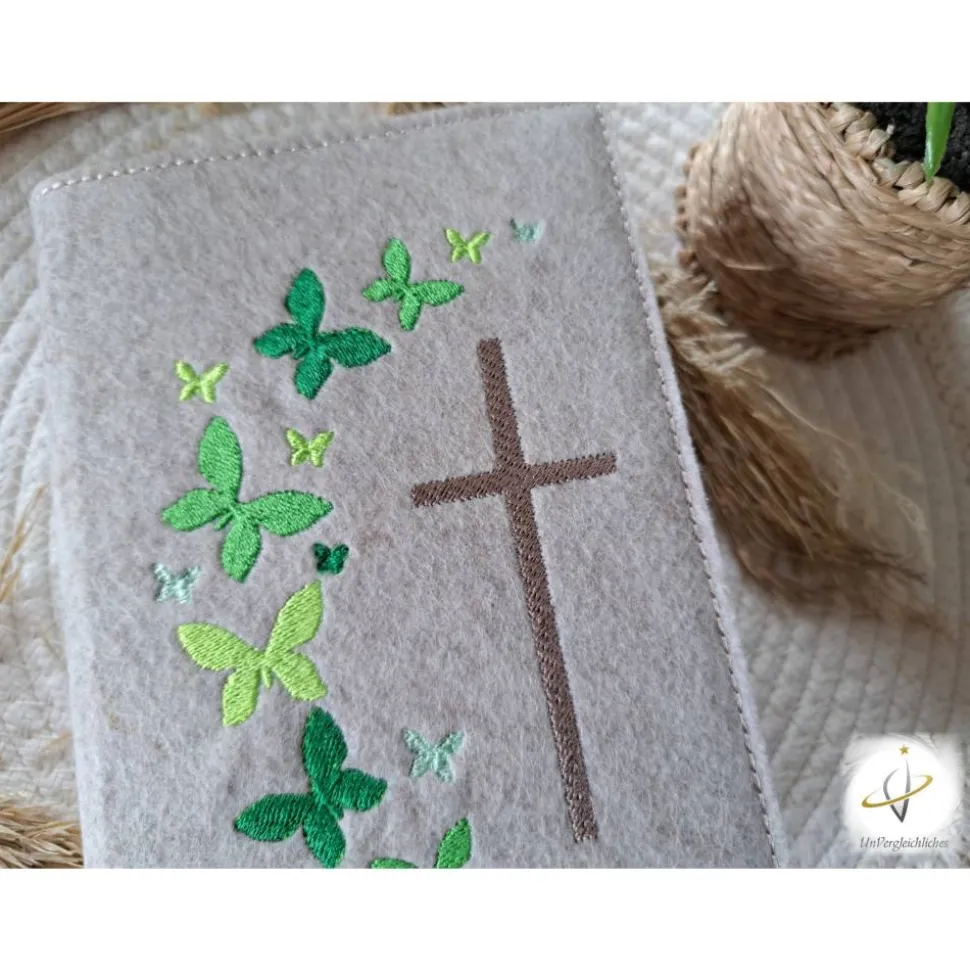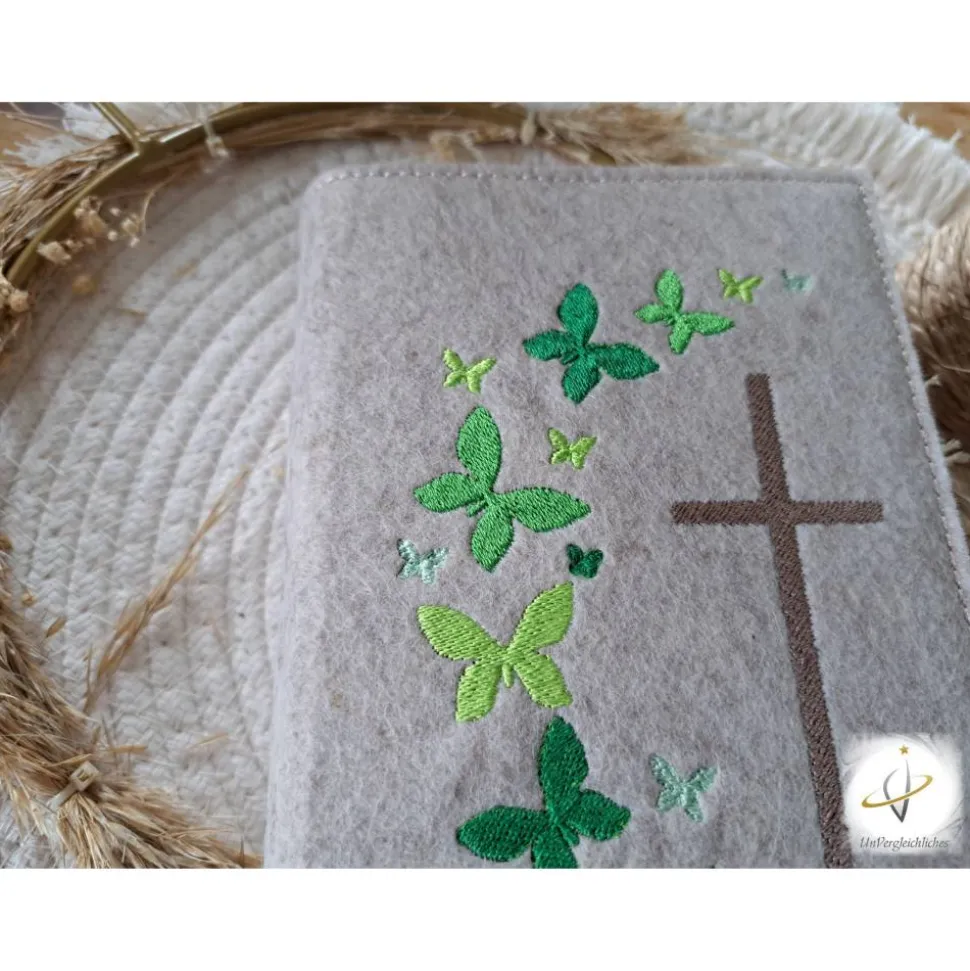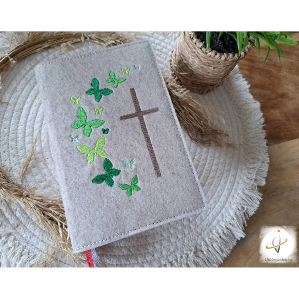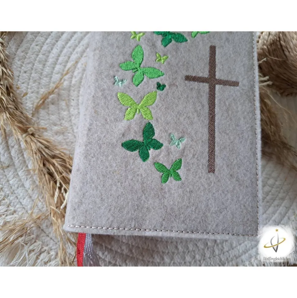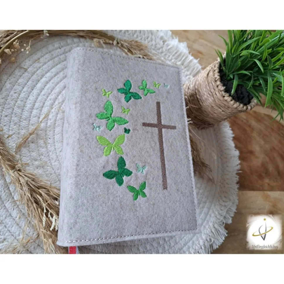 Die Hülle kann individuell mit dem Namen des Kindes und dem Datum der Erstkommunion gestaltet werden, was sie zu einem ganz besonderen Andenken an diesen wichtigen Tag macht. Die Bestickung erfolgt auf der Vorderseite der Hülle und wird mit modernster Technologie präzise und dauerhaft in den Filz eingearbeitet.