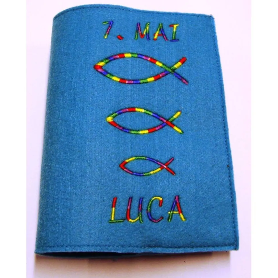Entdecke die hochwertige Gotteslobhülle aus 3 mm starkem Filz in türkis, liebevoll handgefertigt und mit bunten Regenbogenfischen bestickt.
