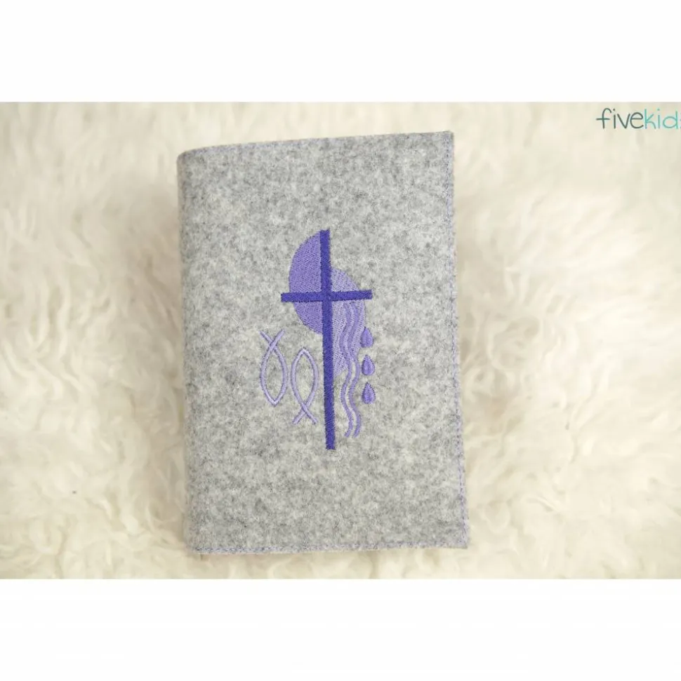 Dieser Einband ist aus hochwertigem Wollfilz gefertigt. Es ist bestickt mit diesem wunderschönen kirchlichen Motiv. Die Farben der Bestickung können Sie auch gerne frei wählen. Hierzu bitte einfach eine Nachricht oder einen Kommentar zum Kauf dazuschreiben. Ansonsten wird es wie in der Abbildung gefertigt. Das verwendete Filz ist hier in einem melierten hellgrau. Bestickt in Lila- und Silbertönen.