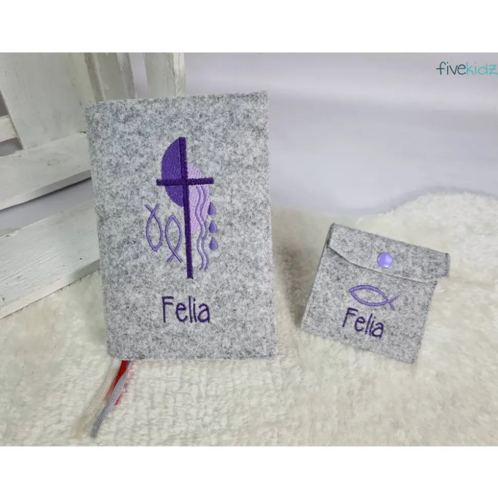 Dieser Einband ist aus hochwertigem Wollfilz gefertigt. Es ist bestickt mit diesem wunderschönen kirchlichen Motiv. Die Farben der Bestickung können Sie auch gerne frei wählen. Hierzu bitte einfach eine Nachricht oder einen Kommentar zum Kauf dazuschreiben. Ansonsten wird es wie in der Abbildung gefertigt. Das verwendete Filz ist hier in einem melierten grau. Bestickt in Lila und Fliedertönen.