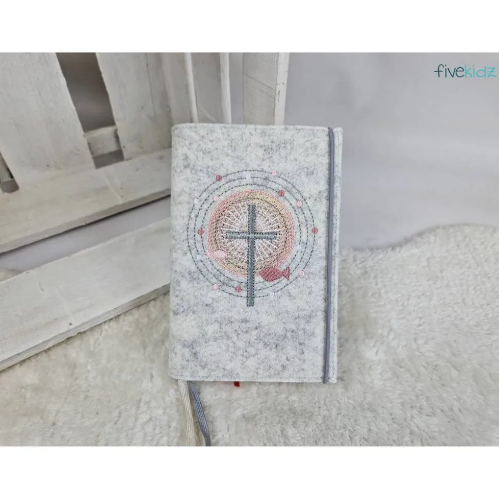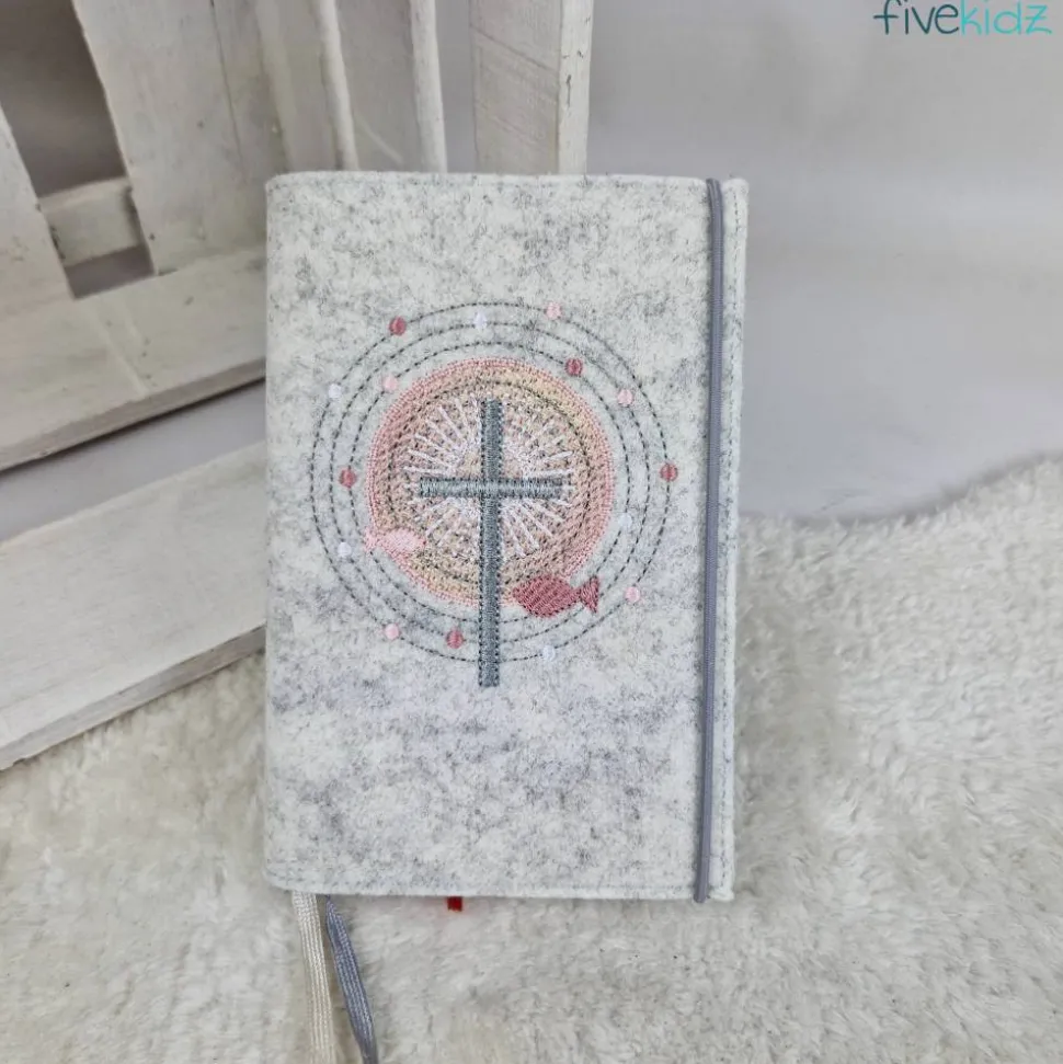 Dieser Einband ist aus hochwertigem Wollfilz gefertigt. Es ist bestickt mit diesem wunderschönen kirchlichen Motiv. Die Farben der Bestickung können Sie auch gerne frei wählen. Hierzu bitte einfach eine Nachricht oder einen Kommentar zum Kauf dazuschreiben. Ansonsten wird es wie in der Abbildung gefertigt. Das verwendete Filz ist hier in einem melierten hellem grau. Bestickt in Altrosa-, Rose- und Silbertönen.