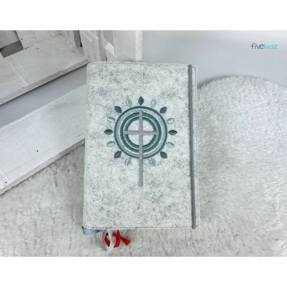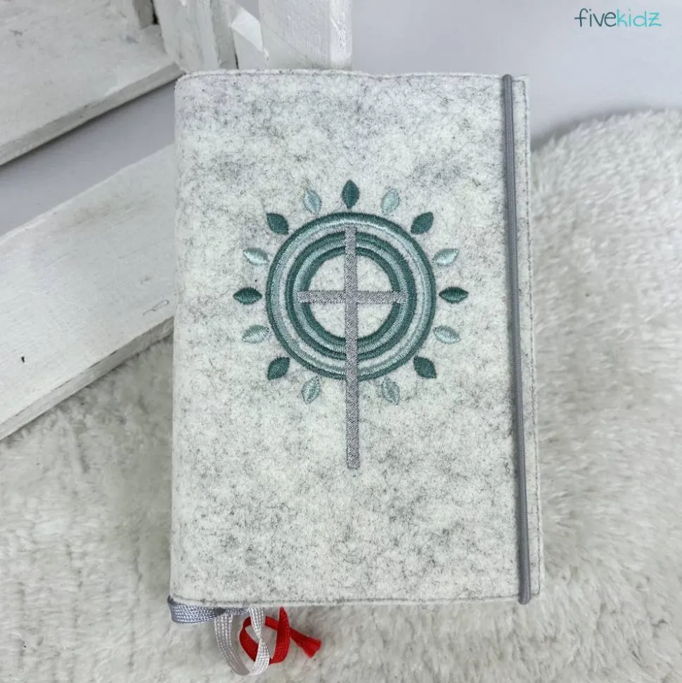 Dieser Einband ist aus hochwertigem Wollfilz gefertigt. Es ist bestickt mit diesem wunderschönen kirchlichen Motiv. Die Farben der Bestickung können Sie auch gerne frei wählen. Hierzu bitte einfach eine Nachricht oder einen Kommentar zum Kauf dazuschreiben. Ansonsten wird es wie in der Abbildung gefertigt. Das verwendete Filz ist hier in einem melierten hellem grau. Bestickt in Altgrün/Salbei und Silber.