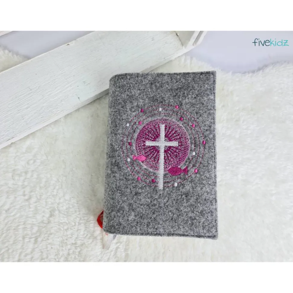 Dieser Einband ist aus hochwertigem Wollfilz gefertigt. Es ist bestickt mit diesem wunderschönen kirchlichen Motiv. Die Farben der Bestickung können Sie auch gerne frei wählen. Hierzu bitte einfach eine Nachricht oder einen Kommentar zum Kauf dazuschreiben. Ansonsten wird es wie in der Abbildung gefertigt. Das verwendete Filz ist hier in einem melierten grau. Bestickt in Beere, Pink und Weiß.