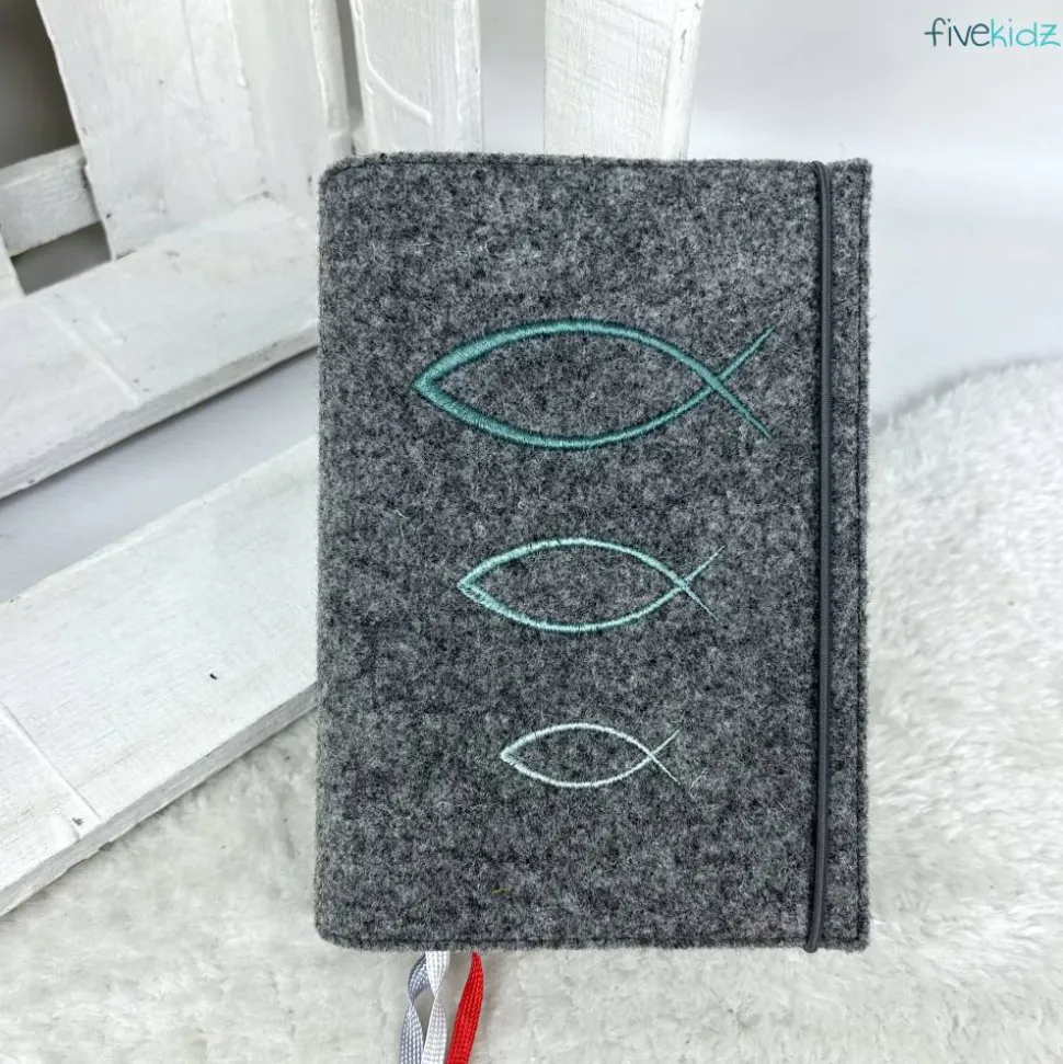 Dieser Einband ist aus hochwertigem Wollfilz gefertigt. Es ist bestickt mit diesem wunderschönen kirchlichen Motiv. Die Farben der Bestickung können Sie auch gerne frei wählen. Hierzu bitte einfach eine Nachricht oder einen Kommentar zum Kauf dazuschreiben. Ansonsten wird es wie in der Abbildung gefertigt. Das verwendete Filz ist hier in einem melierten dunklen grau. Bestickt in Altgrün/Salbei und Mint.