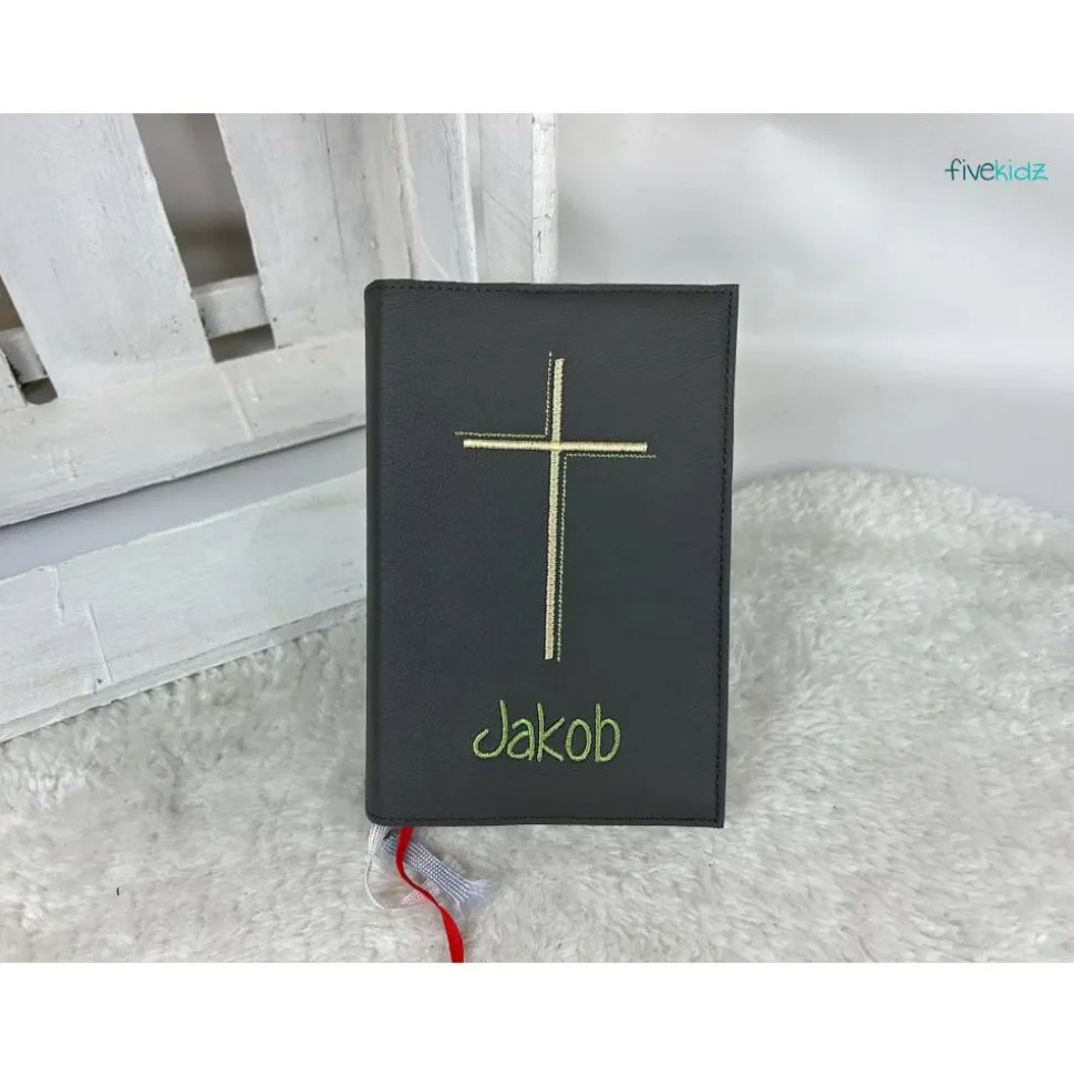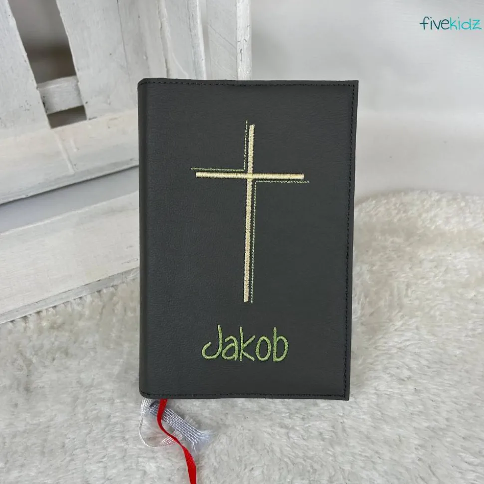 Dieser Einband ist aus hochwertigem Rindsleder gefertigt. Es ist bestickt mit diesem wunderschönen kirchlichen Motiv. Die Farben der Bestickung können Sie auch gerne frei wählen. Hierzu bitte einfach eine Nachricht oder einen Kommentar zum Kauf dazuschreiben. Ansonsten wird es wie in der Abbildung gefertigt. Das verwendete Leder ist hier in einem Anthrazit. Bestickt in Gold und Grün.