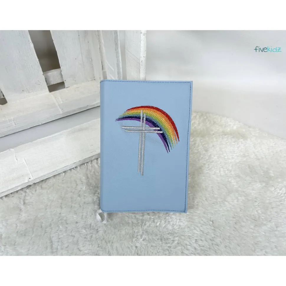 Dieser Einband ist aus echtem Rindsleder gefertigt. Es ist bestickt mit diesem wunderschönen kirchlichen Motiv. Die Farben der Bestickung können Sie auch gerne frei wählen. Hierzu bitte einfach eine Nachricht oder einen Kommentar zum Kauf dazuschreiben. Ansonsten wird es wie in der Abbildung gefertigt. Das verwendete Leder ist hier in einem hellblau. Bestickt in Regenbogenfarben und Silber.