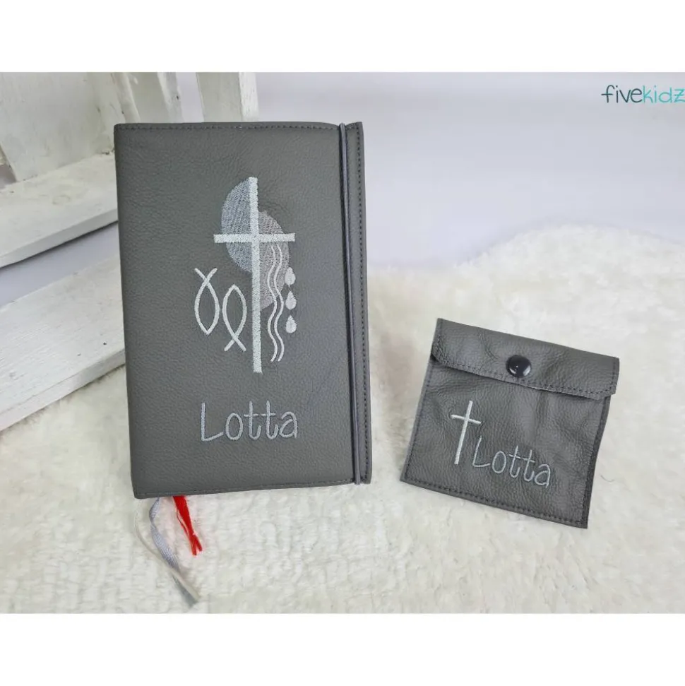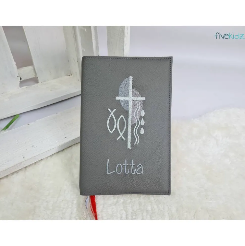Dieser Einband ist aus hochwertigem Echtleder gefertigt. Es ist bestickt mit diesem wunderschönen kirchlichen Motiv. Die Farben der Bestickung können Sie auch gerne frei wählen. Hierzu bitte einfach eine Nachricht oder einen Kommentar zum Kauf dazuschreiben. Ansonsten wird es wie in der Abbildung gefertigt. Das verwendete Leder ist hier in einem dunklen grau. Bestickt in Lila, Weiß- und Silbertönen.