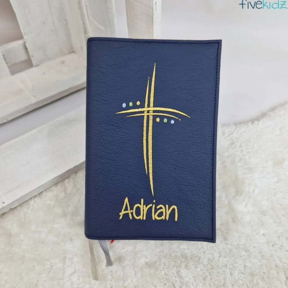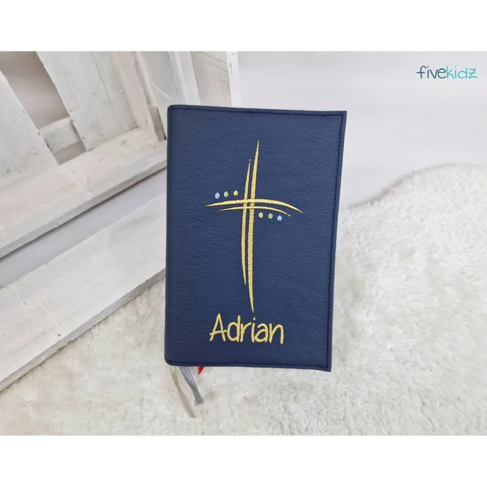 Dieser Einband ist aus hochwertigem Echtleder gefertigt. Es ist bestickt mit diesem wunderschönen kirchlichen Motiv. Die Farben der Bestickung können Sie auch gerne frei wählen. Hierzu bitte einfach eine Nachricht oder einen Kommentar zum Kauf dazuschreiben. Ansonsten wird es wie in der Abbildung gefertigt. Das verwendete Leder ist hier in einem dunklen blau. Bestickt in Gold.