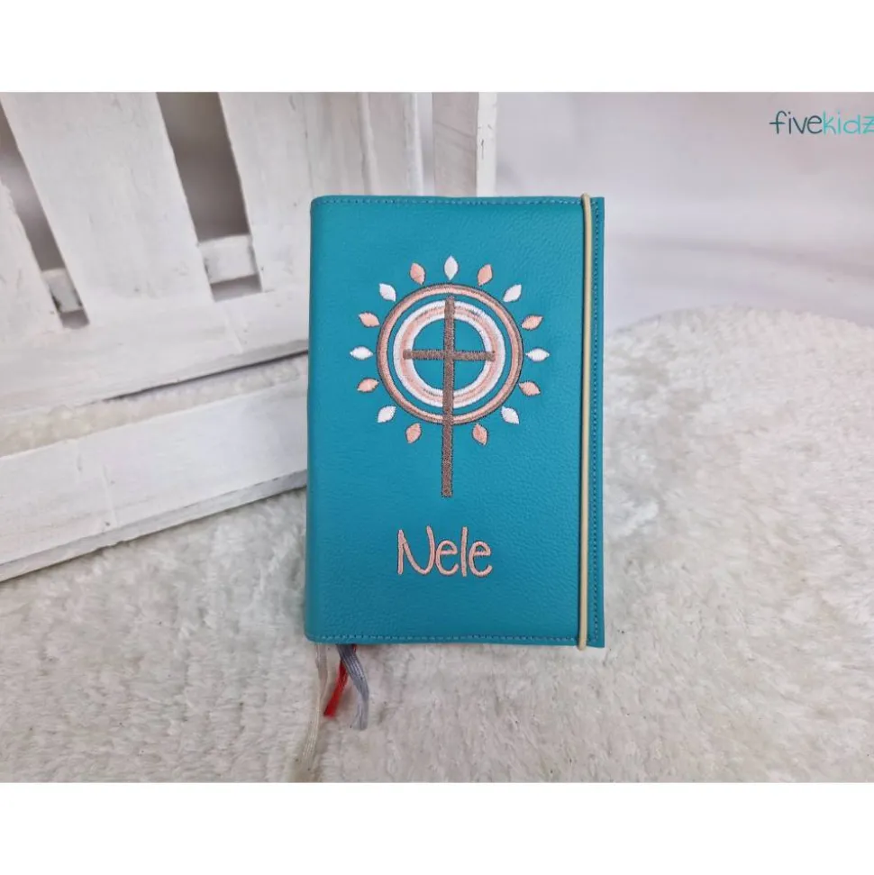 Dieser Einband ist aus hochwertigem Echtleder gefertigt. Es ist bestickt mit diesem wunderschönen kirchlichen Motiv. Die Farben der Bestickung können Sie auch gerne frei wählen. Hierzu bitte einfach eine Nachricht oder einen Kommentar zum Kauf dazuschreiben. Ansonsten wird es wie in der Abbildung gefertigt. Das verwendete Leder ist hier in einem petrol-türkis. Bestickt in Rose, Lachsrosa und Creme-Beige.