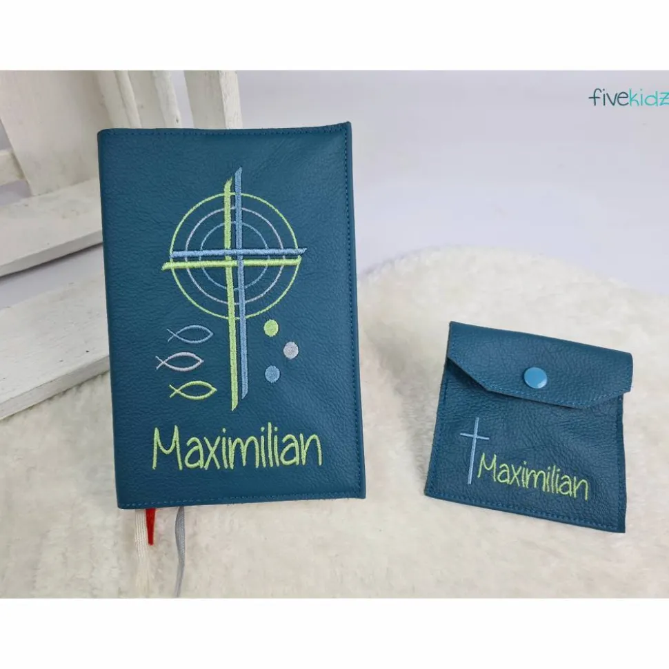 Dieser Einband ist aus hochwertigem Echtleder gefertigt. Es ist bestickt mit diesem wunderschönen kirchlichen Motiv. Die Farben der Bestickung können Sie auch gerne frei wählen. Hierzu bitte einfach eine Nachricht oder einen Kommentar zum Kauf dazuschreiben. Ansonsten wird es wie in der Abbildung gefertigt. Das verwendete Leder ist hier in einem dunklen Petrol. Bestickt in Lila- und Silbertönen.