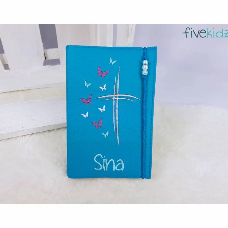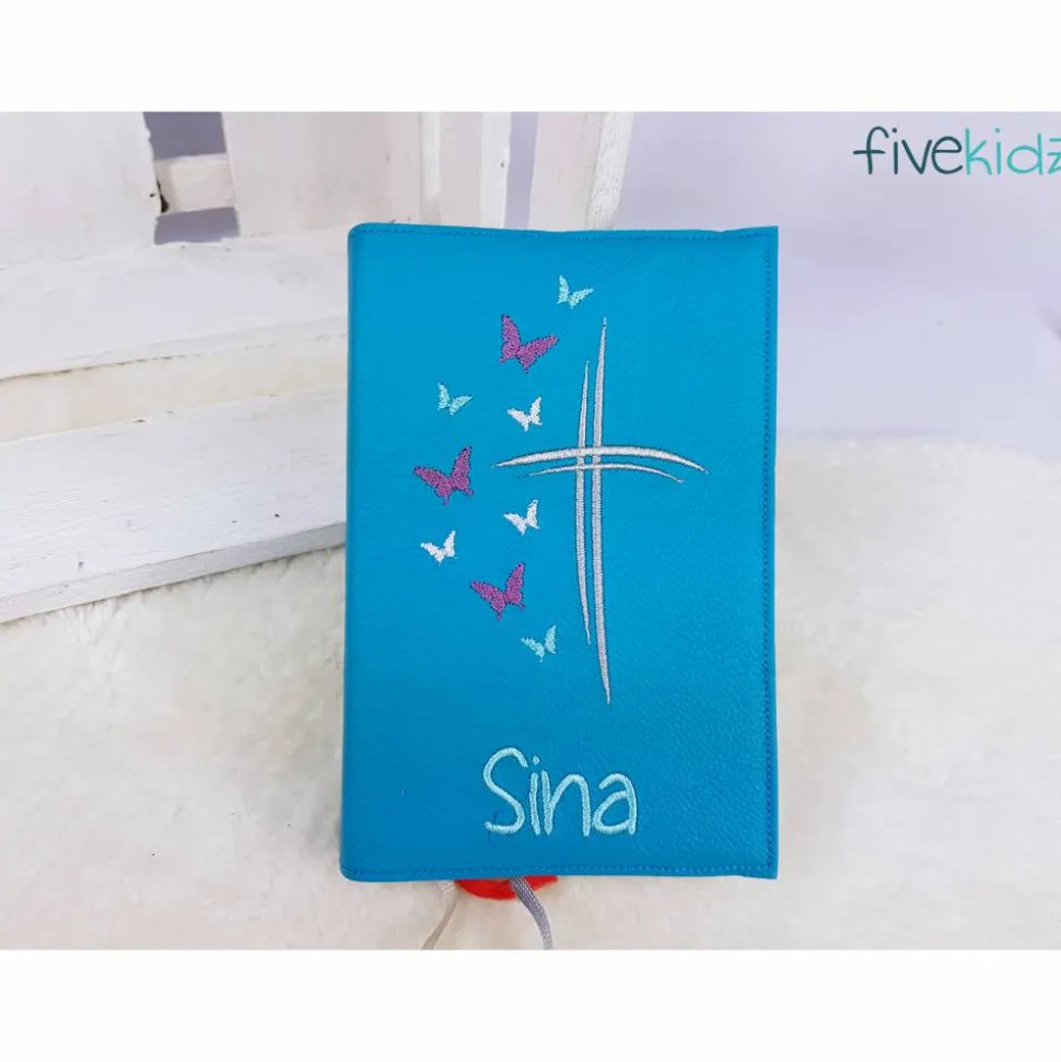 Dieser Einband ist aus hochwertigem Echtleder gefertigt. Es ist bestickt mit diesem wunderschönen kirchlichen Motiv mit Kreuz und Schmetterlingen. Die Farben der Bestickung können Sie auch gerne frei wählen. Hierzu bitte einfach eine Nachricht oder einen Kommentar zum Kauf dazuschreiben. Ansonsten wird es wie in der Abbildung gefertigt. Das verwendete Leder ist hier in einem petrol-türkis. Bestickt in Mint- Beere- und Silbertönen.