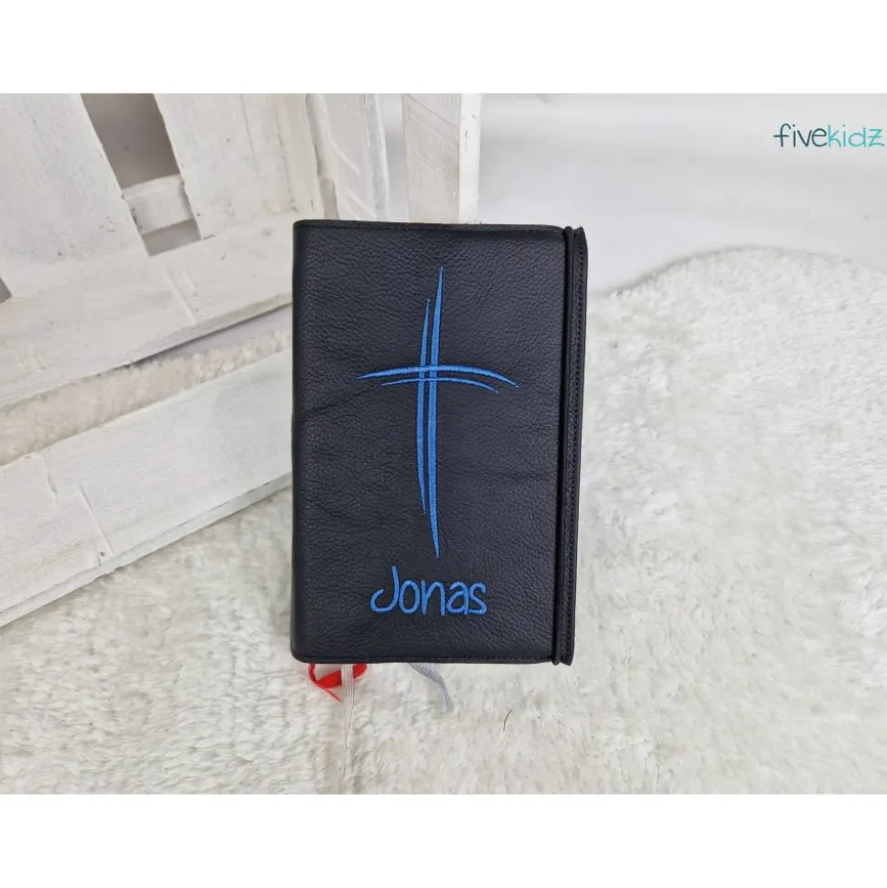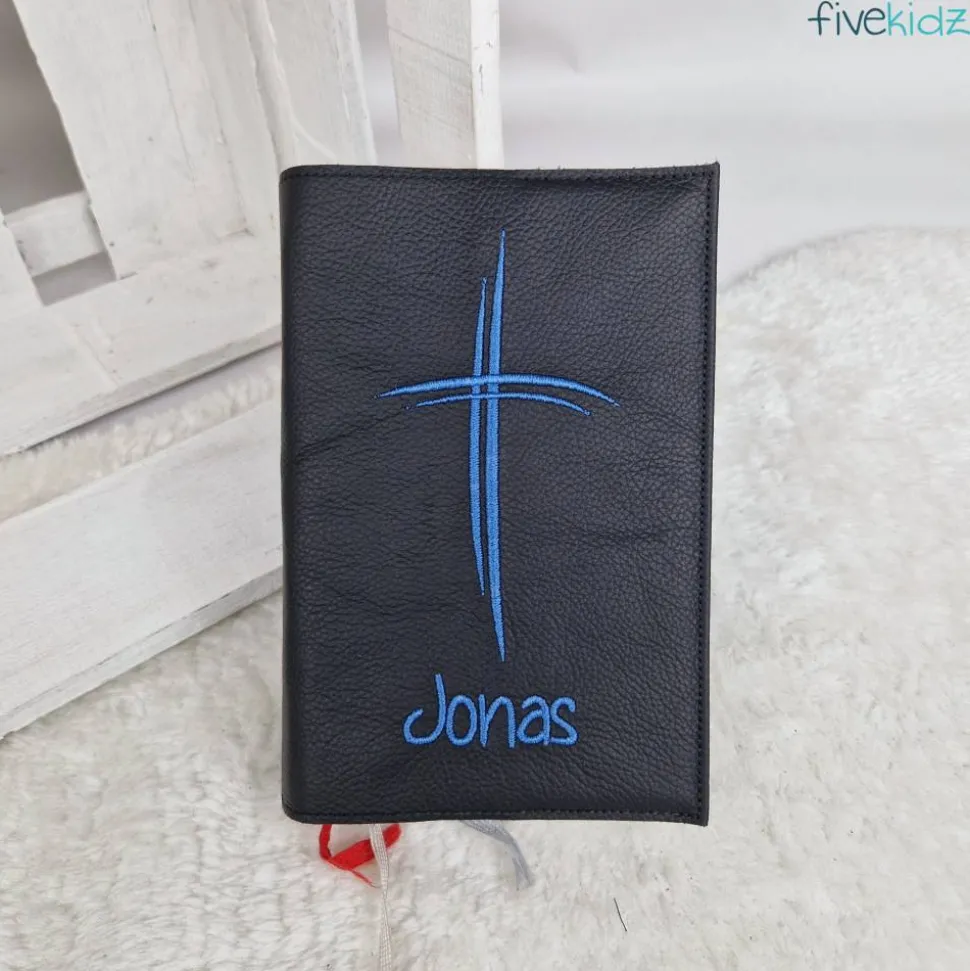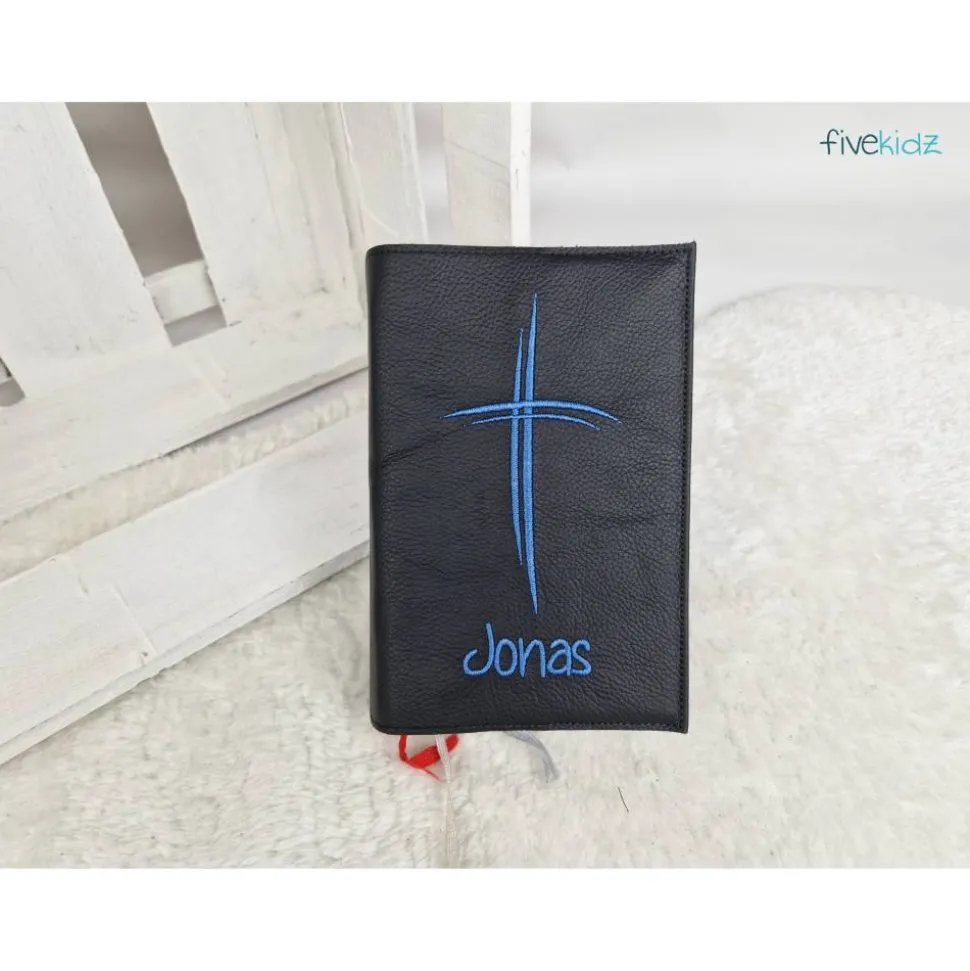 Dieser Einband ist aus hochwertigem Echtleder gefertigt. Es ist bestickt mit diesem wunderschönen kirchlichen Motiv mit Kreuz und Schmetterlingen. Die Farben der Bestickung können Sie auch gerne frei wählen. Hierzu bitte einfach eine Nachricht oder einen Kommentar zum Kauf dazuschreiben. Ansonsten wird es wie in der Abbildung gefertigt. Das verwendete Leder ist hier in einem Schwarz. Bestickt in dunklem Jeansblau.