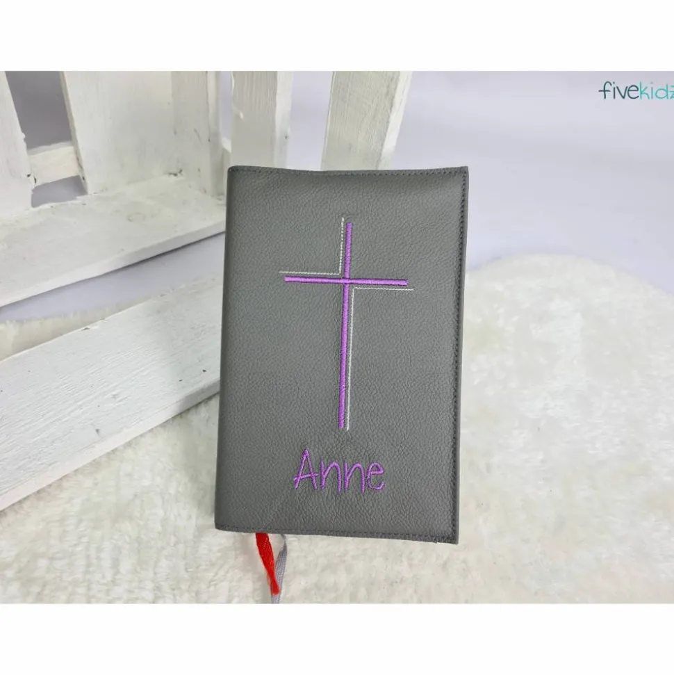 Dieser Einband ist aus hochwertigem Echtleder gefertigt. Es ist bestickt mit diesem wunderschönen kirchlichen Motiv. Die Farben der Bestickung können Sie auch gerne frei wählen. Hierzu bitte einfach eine Nachricht oder einen Kommentar zum Kauf dazuschreiben. Ansonsten wird es wie in der Abbildung gefertigt. Das verwendete Leder ist hier in einem dunklen grau. Bestickt in Lila- und Silbertönen.