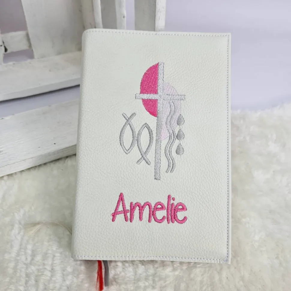 Dieser Einband ist aus hochwertigem Echtleder gefertigt. Es ist bestickt mit diesem wunderschönen kirchlichen Motiv. Die Farben der Bestickung können Sie auch gerne frei wählen. Hierzu bitte einfach eine Nachricht oder einen Kommentar zum Kauf dazuschreiben. Ansonsten wird es wie in der Abbildung gefertigt. Das verwendete Leder ist hier in einem altweiß. Bestickt in Pink-, Rosa- und Silbertönen.
