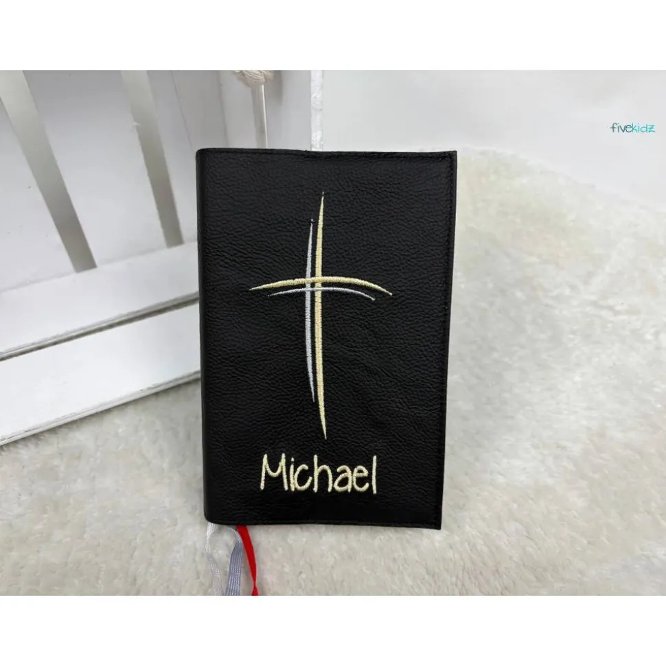 Dieser Einband ist aus hochwertigem Rindsleder gefertigt. Es ist bestickt mit diesem wunderschönen kirchlichen Motiv. Die Farben der Bestickung können Sie auch gerne frei wählen. Hierzu bitte einfach eine Nachricht oder einen Kommentar zum Kauf dazuschreiben. Ansonsten wird es wie in der Abbildung gefertigt. Das verwendete Leder ist hier in einem Schwarz. Bestickt in Gold und Silber.