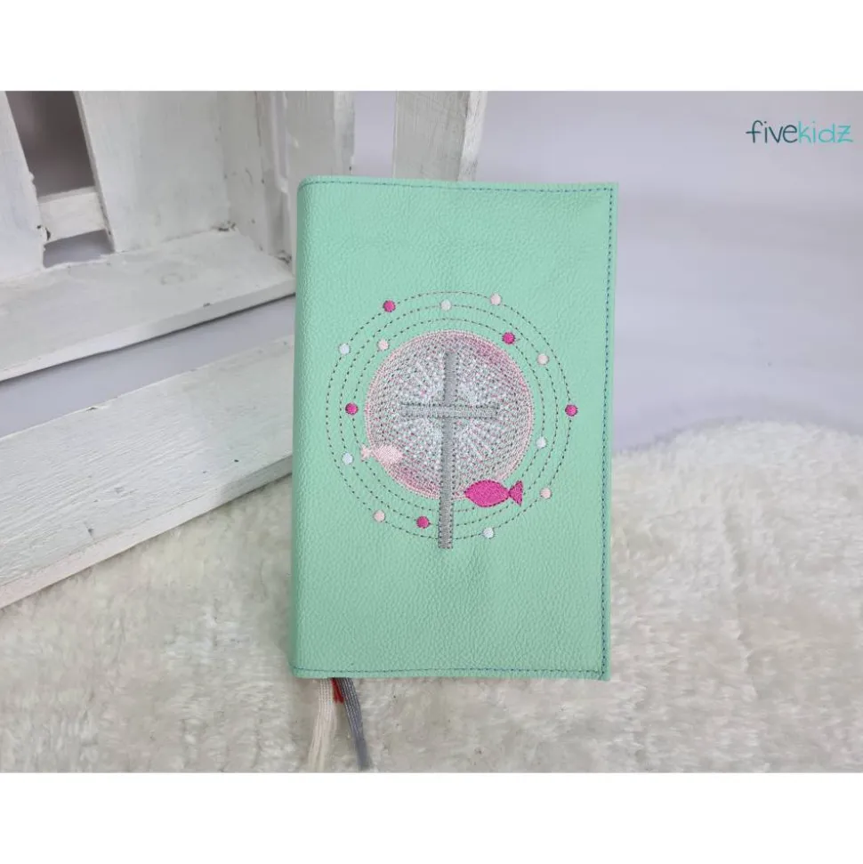 Dieser Einband ist aus hochwertigem Echtleder gefertigt. Es ist bestickt mit diesem wunderschönen kirchlichen Motiv. Die Farben der Bestickung können Sie auch gerne frei wählen. Hierzu bitte einfach eine Nachricht oder einen Kommentar zum Kauf dazuschreiben. Ansonsten wird es wie in der Abbildung gefertigt. Das verwendete Leder ist hier in einem Mint. Bestickt in Pink-, Rosa- und Silbertönen.