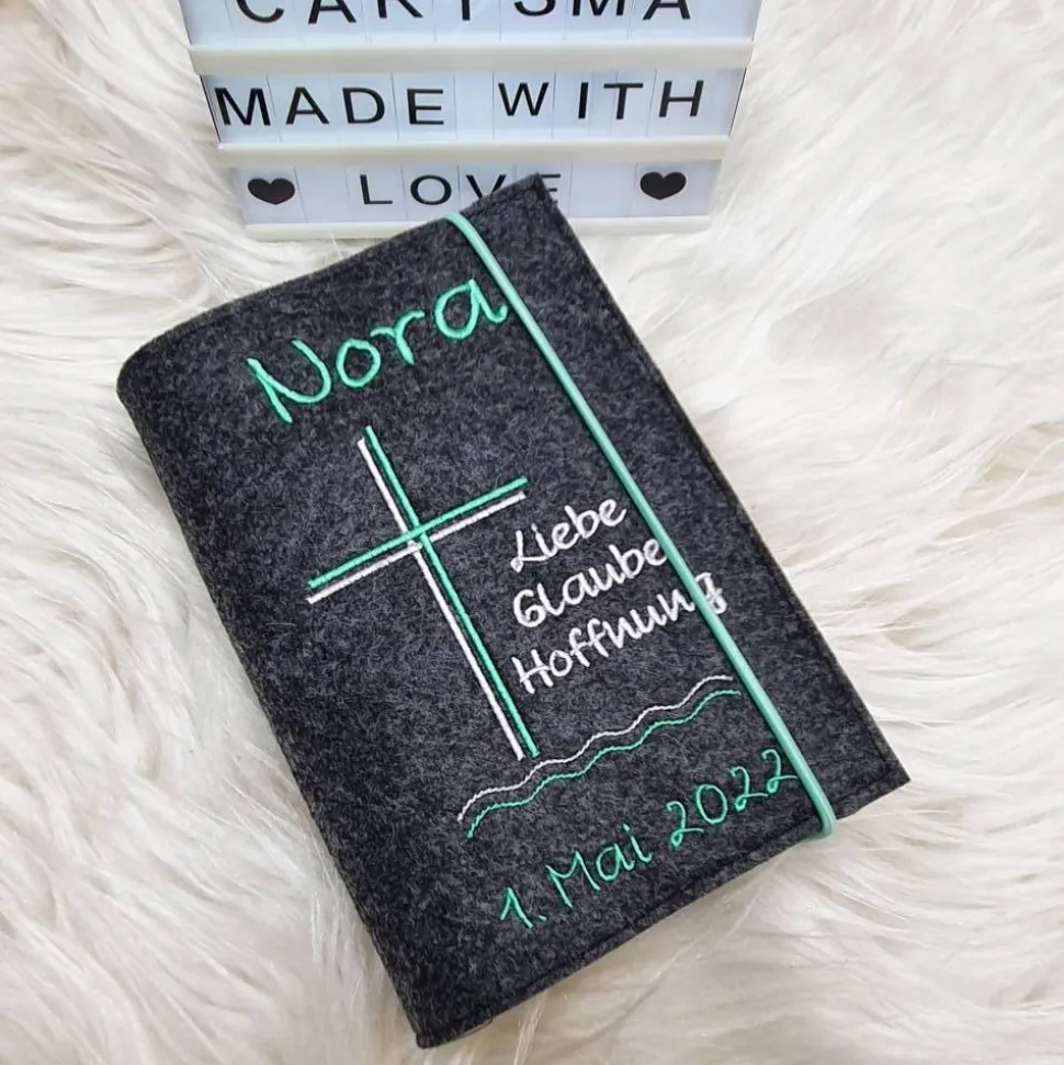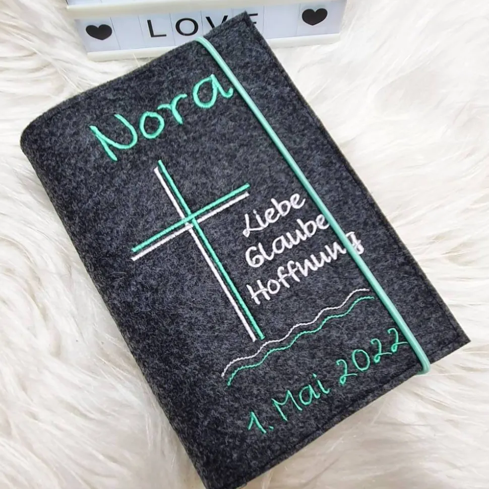 Hochwertige Gotteslobhülle aus Polyesterfilz (3,0 mm), bestickt mit einem Kreuz und den Worten Liebe Glaube Hoffnung (gerne auch mit dem Namen und Datum gegen Aufpreis).