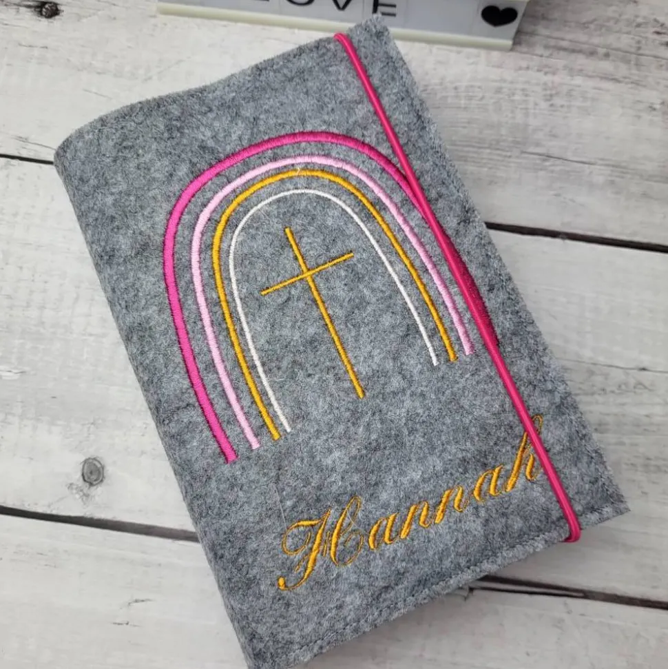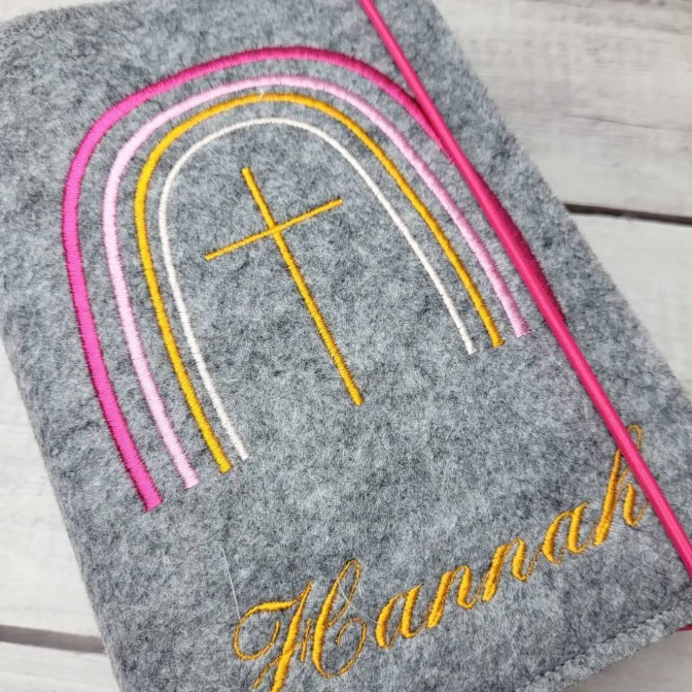 Hochwertige Gotteslobhülle aus Polyesterfilz (3,0 mm), bestickt mit einem Kreuz und Regenbogen (gerne auch mit dem Namen und Datum).