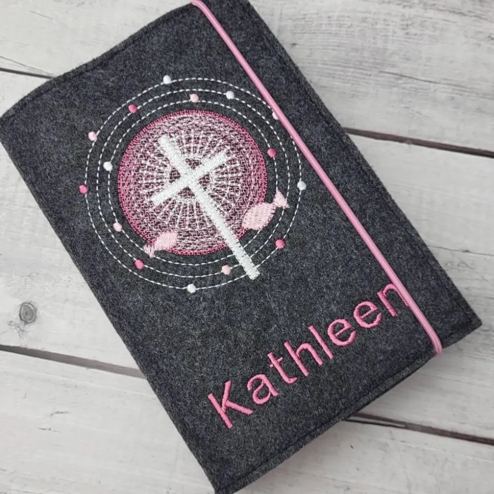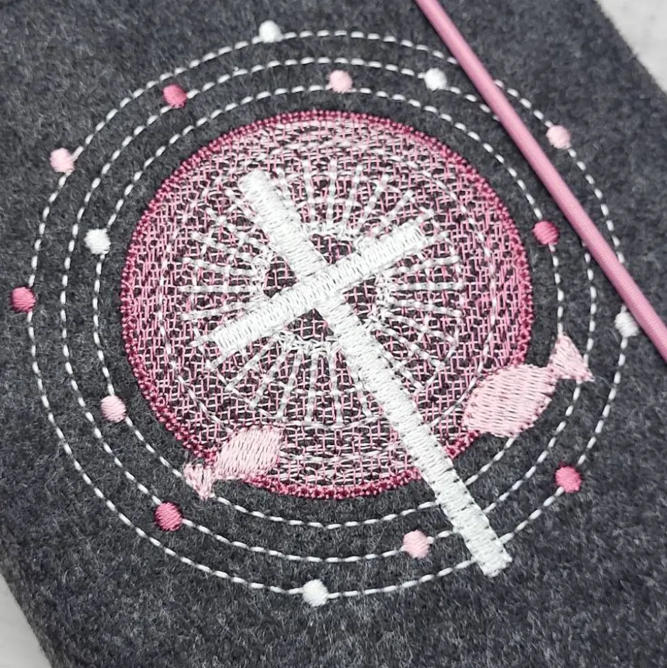 Diese Gotteslobhülle wird bestickt mit einem strahlendem Kreuz (gerne auch mit dem Namen und Datum gegen Aufpreis). Zum Schließen wird ein Gummiband in passender Farbe eingenäht.