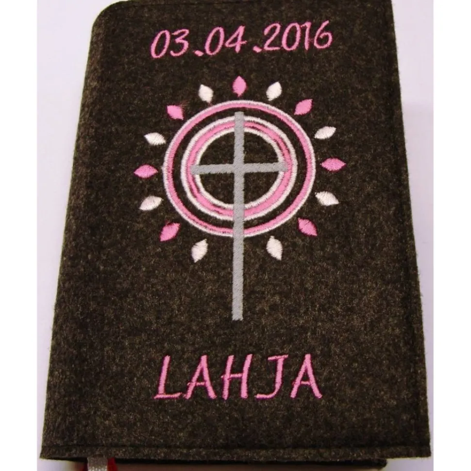 Gotteslobhülle handgefertigt Filz 3mm graumeliert Kreuz Kreise Strahlen rosa personalisierbar Name und Datum bestickt