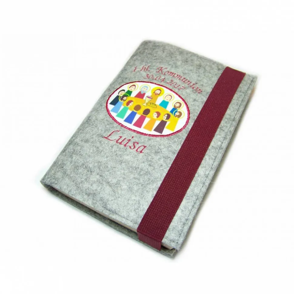 Das Gotteslob wird sich in dieser schicken Gotteslobhülle aus hochwertigem 100% Merino Wollfilz mit selbstentworfenem Abendmahlaufdruck als Aufnäher und passender Stickerei „1.hl. Kommunion“ inkl. individuellem Namen/Datum sicher sehr wohl fühlen 😉