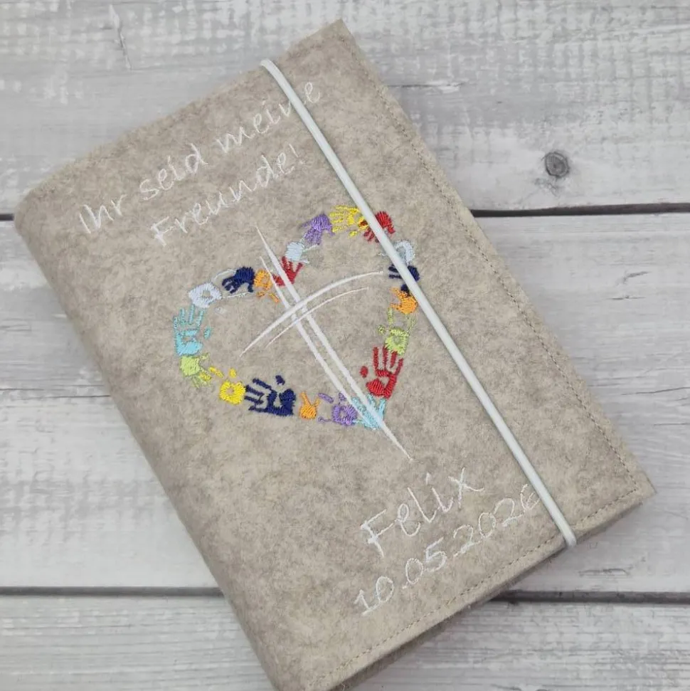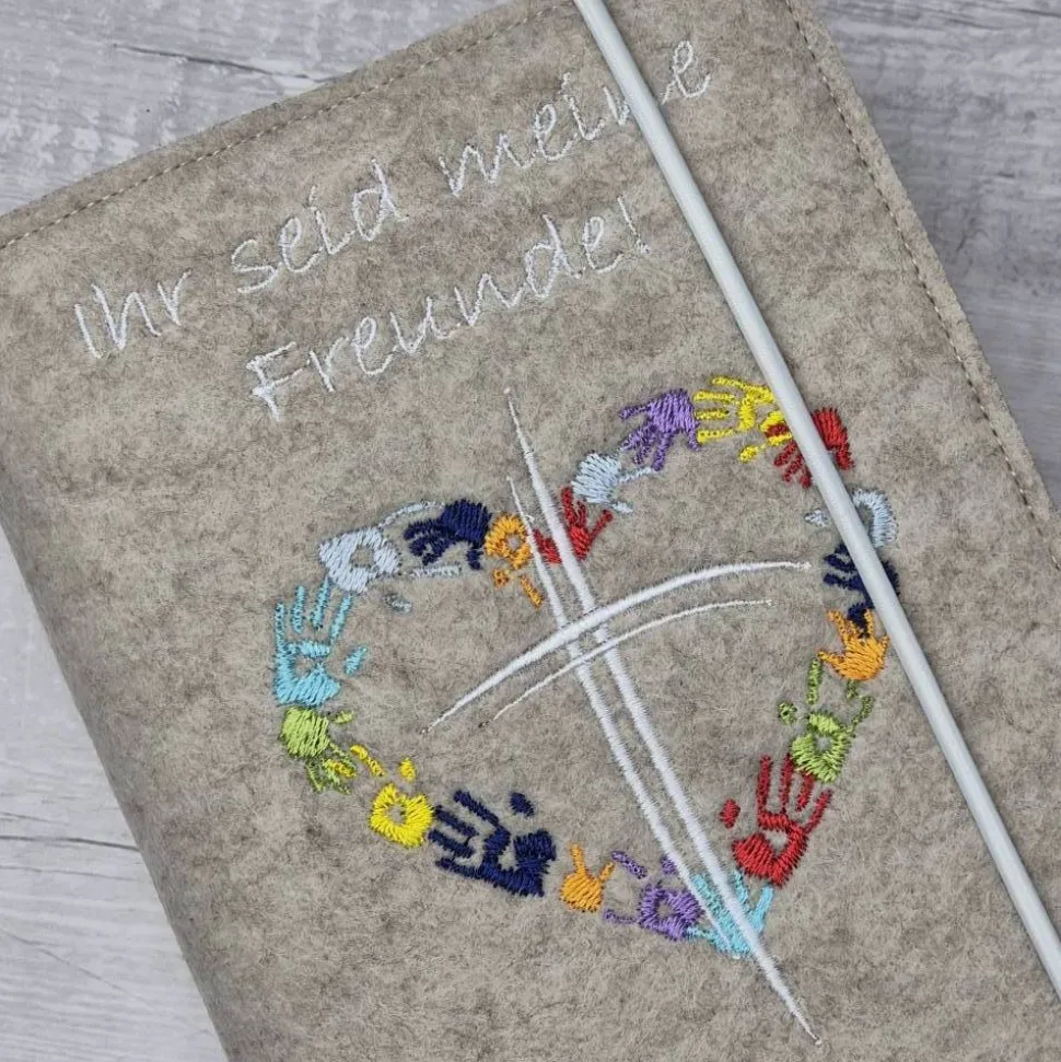 Hochwertige Gotteslobhülle aus Polyesterfilz (3,0 mm), bestickt mit einem Kreuz und Händen in Herzform mit dem Motto“Ihr seid meine Freunde“ (gerne auch mit dem Namen und Datum gegen Aufpreis).