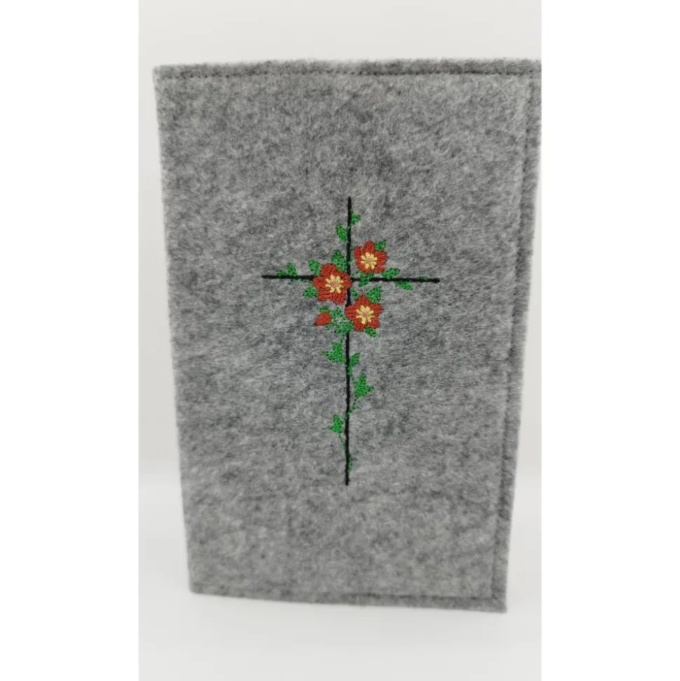 Ein Kreuz mit Blumen wird auf die Hülle gestickt.