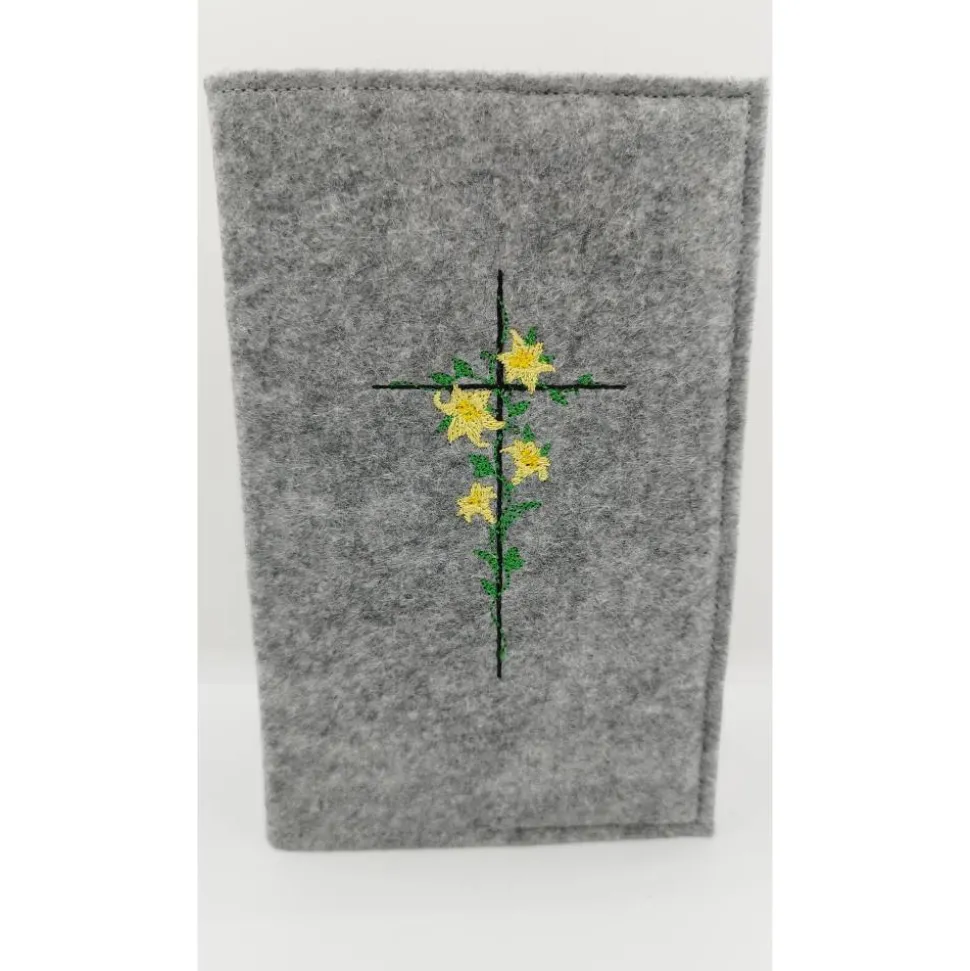 Ein Kreuz mit Lilien wird auf die Hülle gestickt.