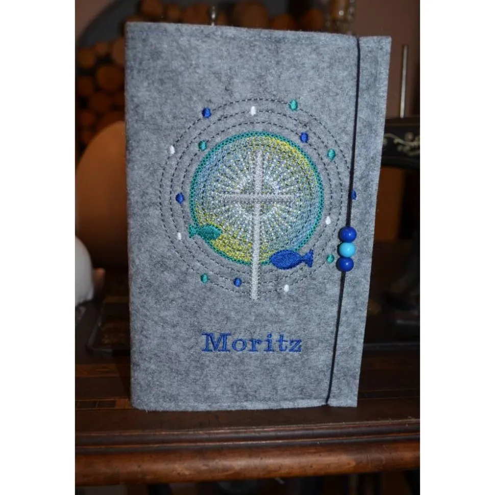 Der Filz ist „GRAU“, das Motiv wird in blau-türkis-tönen gestickt.