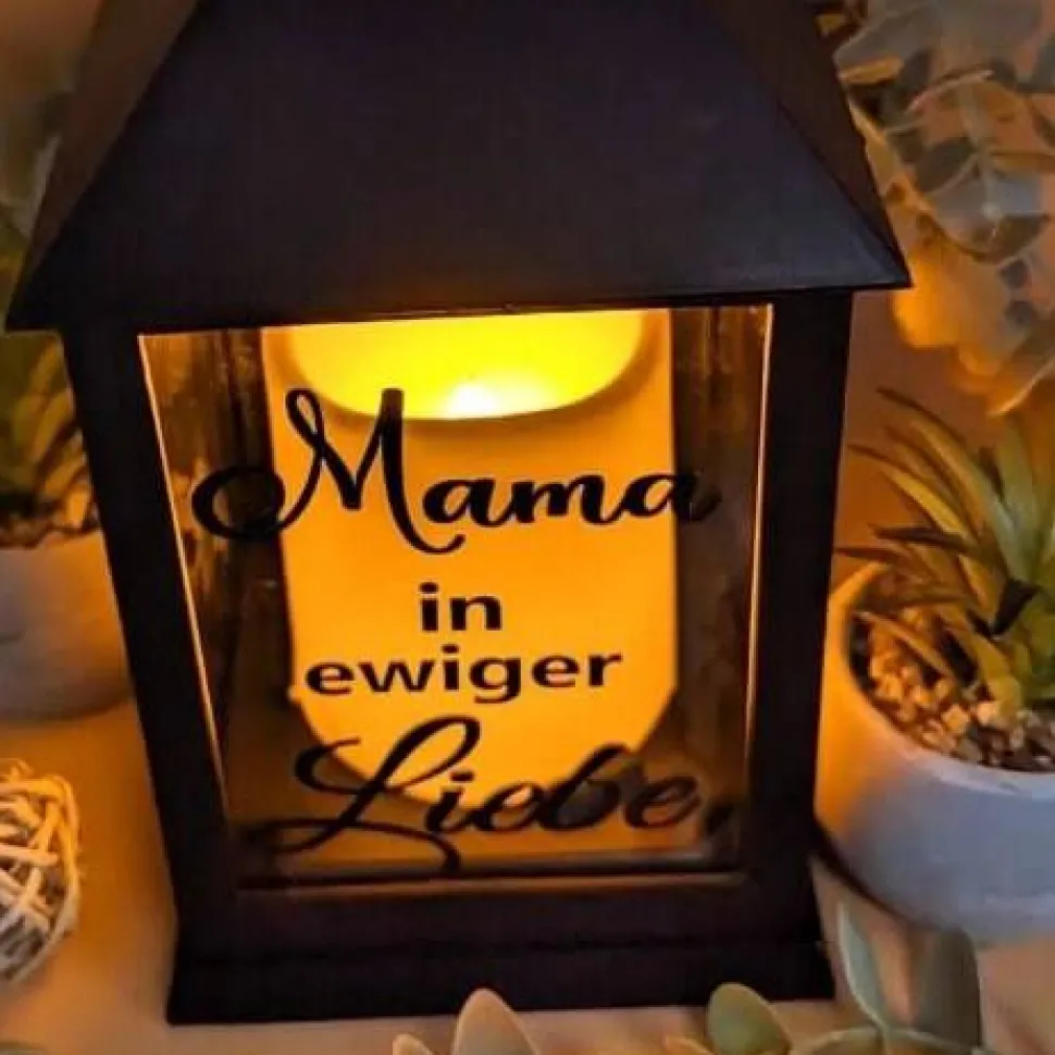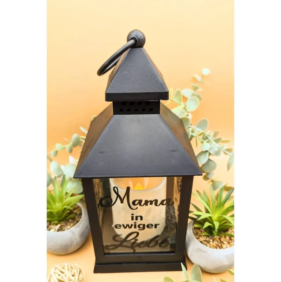 Die Laterne hat 4 Seiten. Auf die Tür (vorne) kann ein Name. Auf den anderen Seiten befinden sich 2x ein Blumenmotiv und hinten ein Herz.