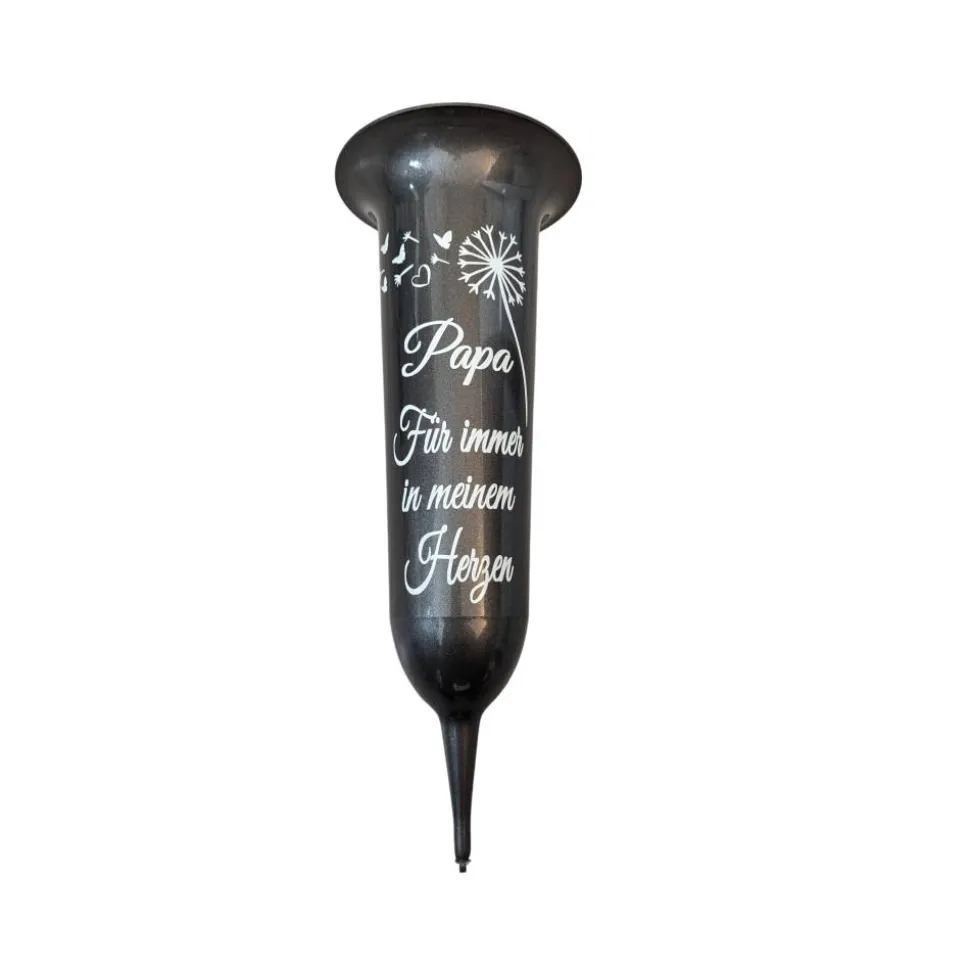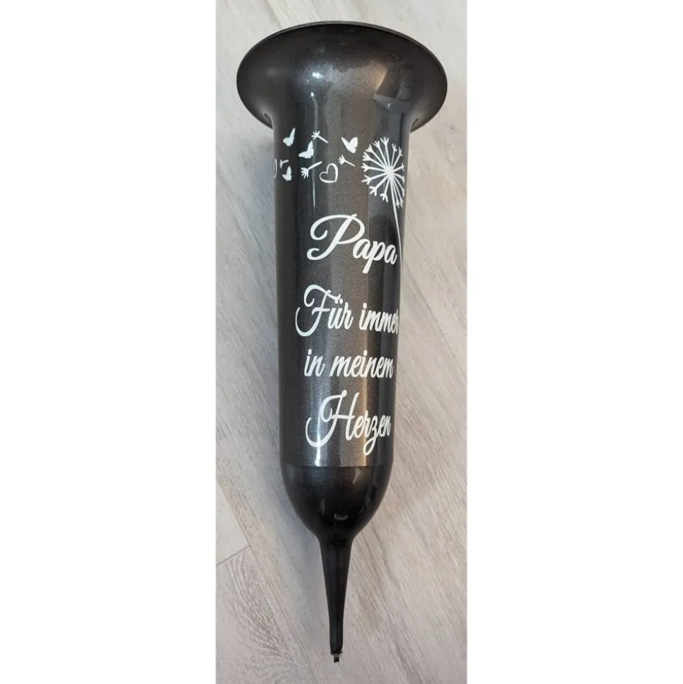 Diese hochwertige Grabvase in elegantem Anthrazit besticht durch ihr feines Pusteblumen-Motiv und einen liebevollen Spruch, der Trost spendet.
