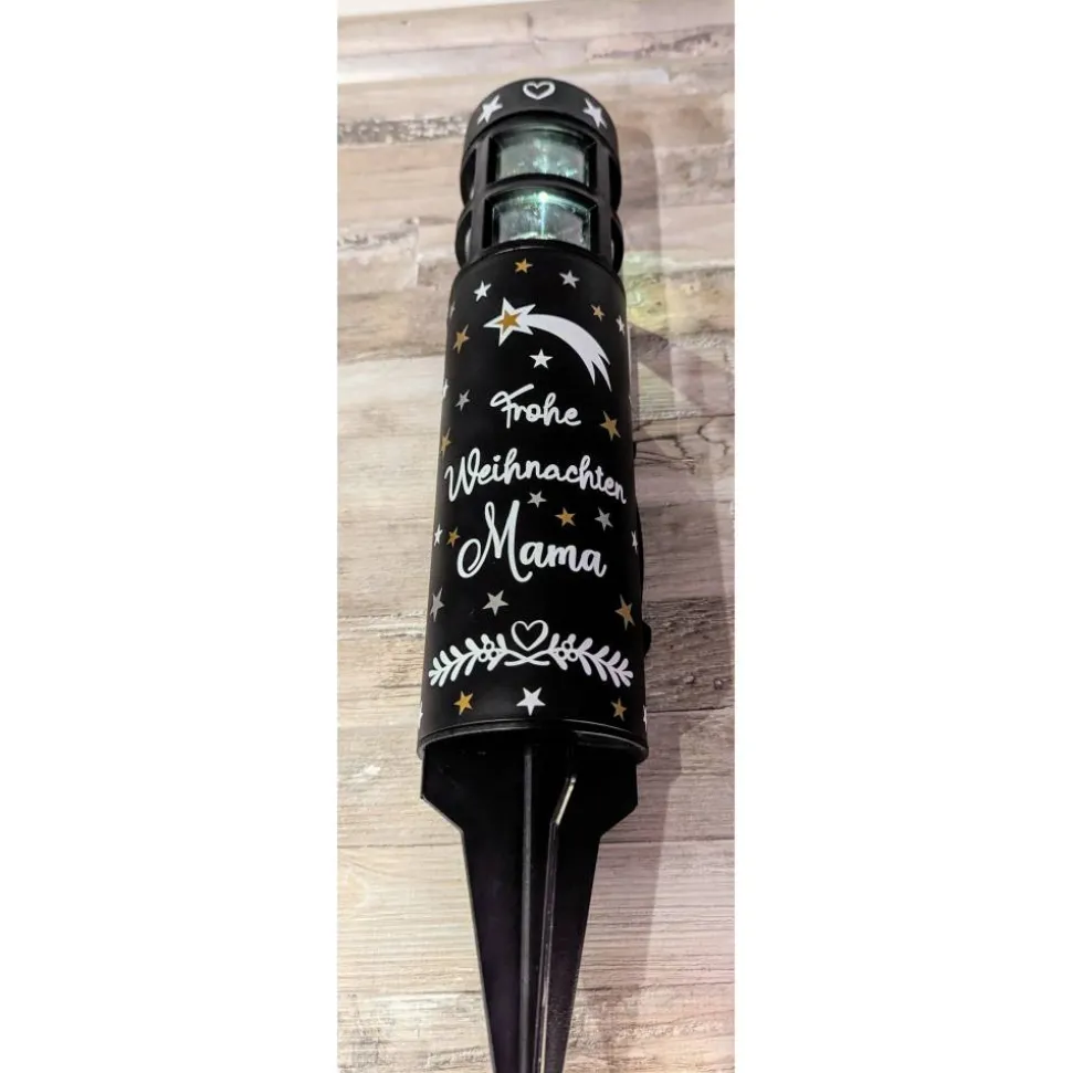 Die Solarleuchte wird personalisiert mit hochwertiger Vinylfolie, die extra für den Outdoor Bereich ist.