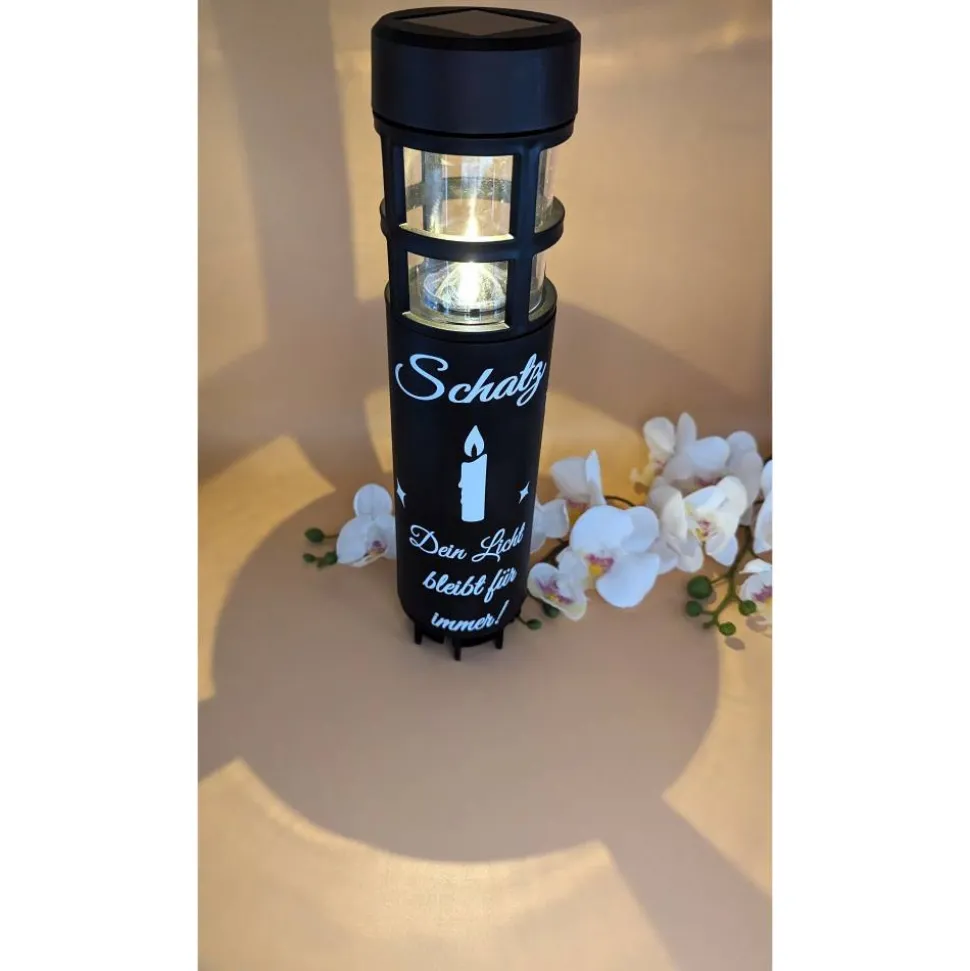Die Solarleuchte wird personalisiert mit hochwertiger Vinylfolie, die extra für den Outdoor Bereich ist.