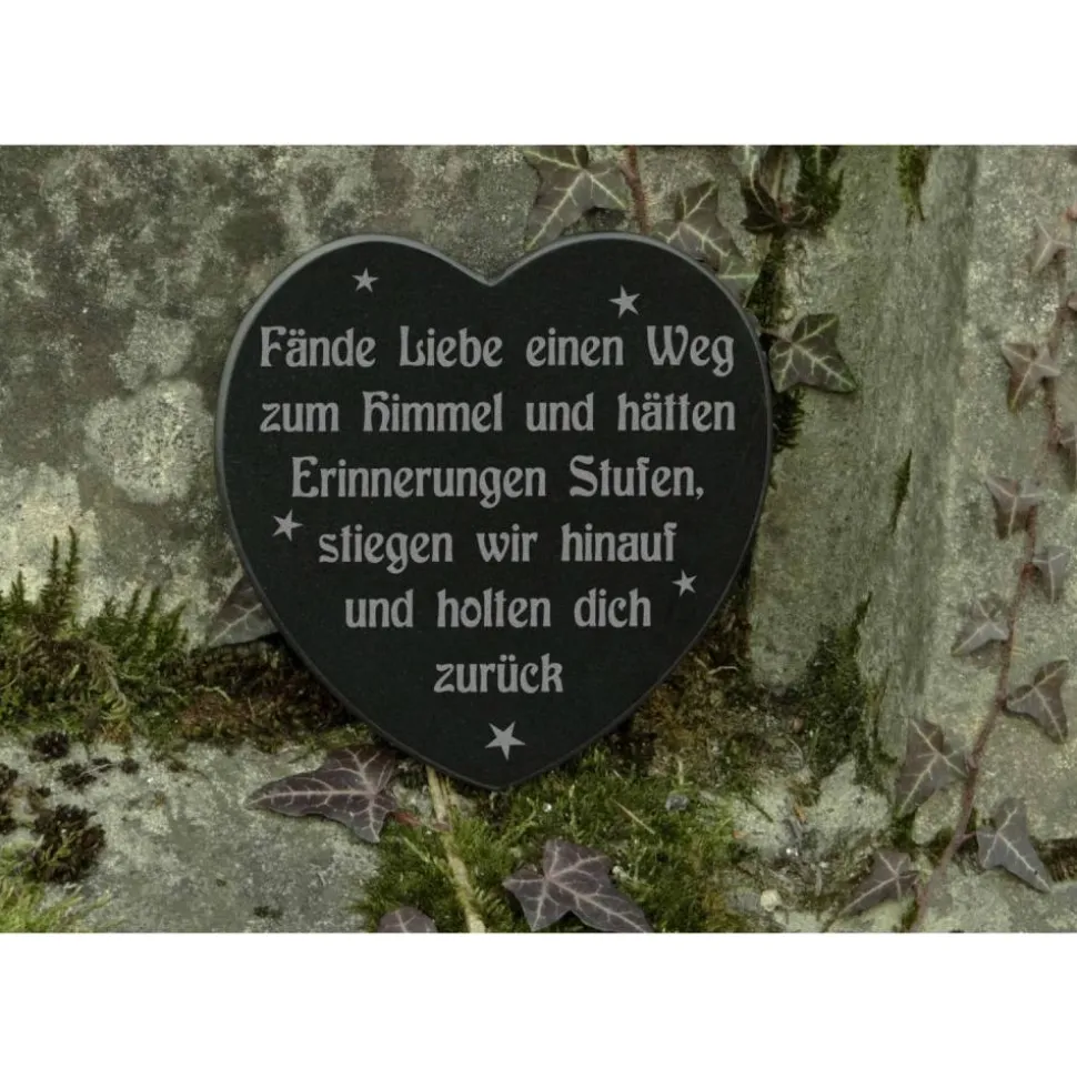 Dieses Herz aus schwarzem Marmor haben wir als Grabschmuck entworfen, der die letzte Ruhestätte noch mit einem Trauerspruch ziert. In silberfarben schimmernder Gravur ist der Spruch „Fände Liebe einen Weg zum Himmel und hätten Erinnerungen Stufen, stiegen wir hinauf und holten dich zurück“ mit Sternchen in die hochglänzende Oberfläche graviert.