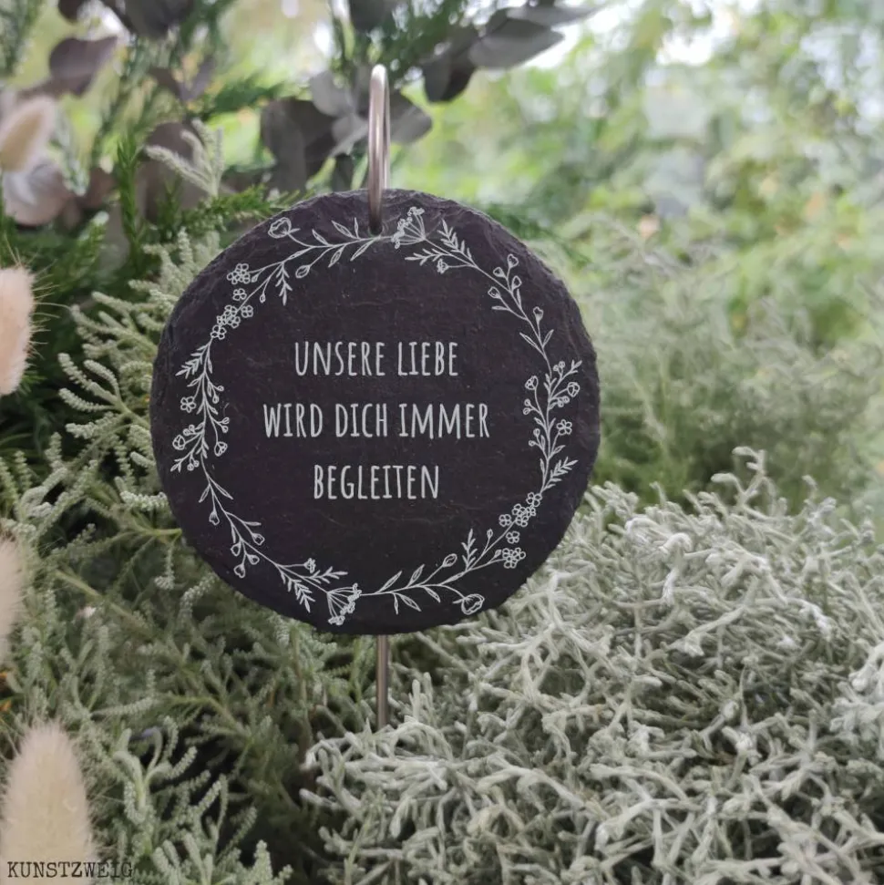 Die Schiefertafel mit wundervollem Trauerspruch kann mit Hilfe des Erdstabes auf das Grab gesteckt werden. Du kannst es auch verschenken, um Angehörigen deine Anteilnahme auf besondere Weise mitzuteilen.