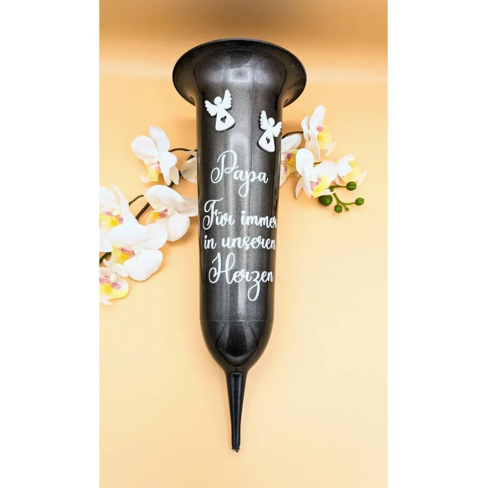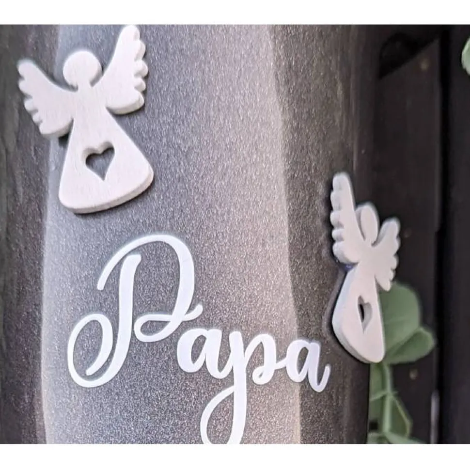Dieses wunderschöne Grabvase ist mit 2 Engeln in 3D aus Holz bestückt und Text.