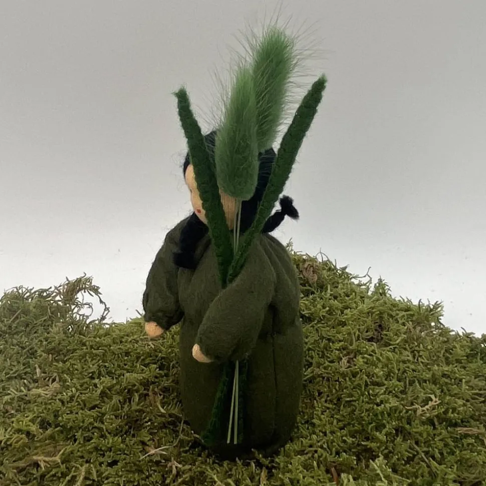 Sie haben 2 Halme getrocknetes Legurus Gras und 2 aus Filz genähte Gradhalme im Arm.